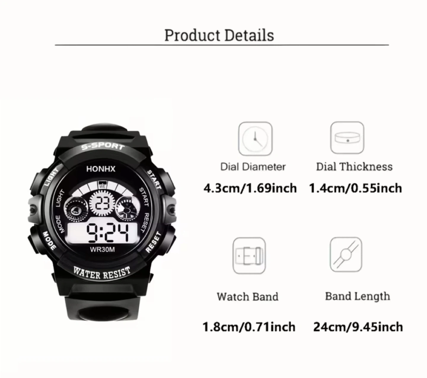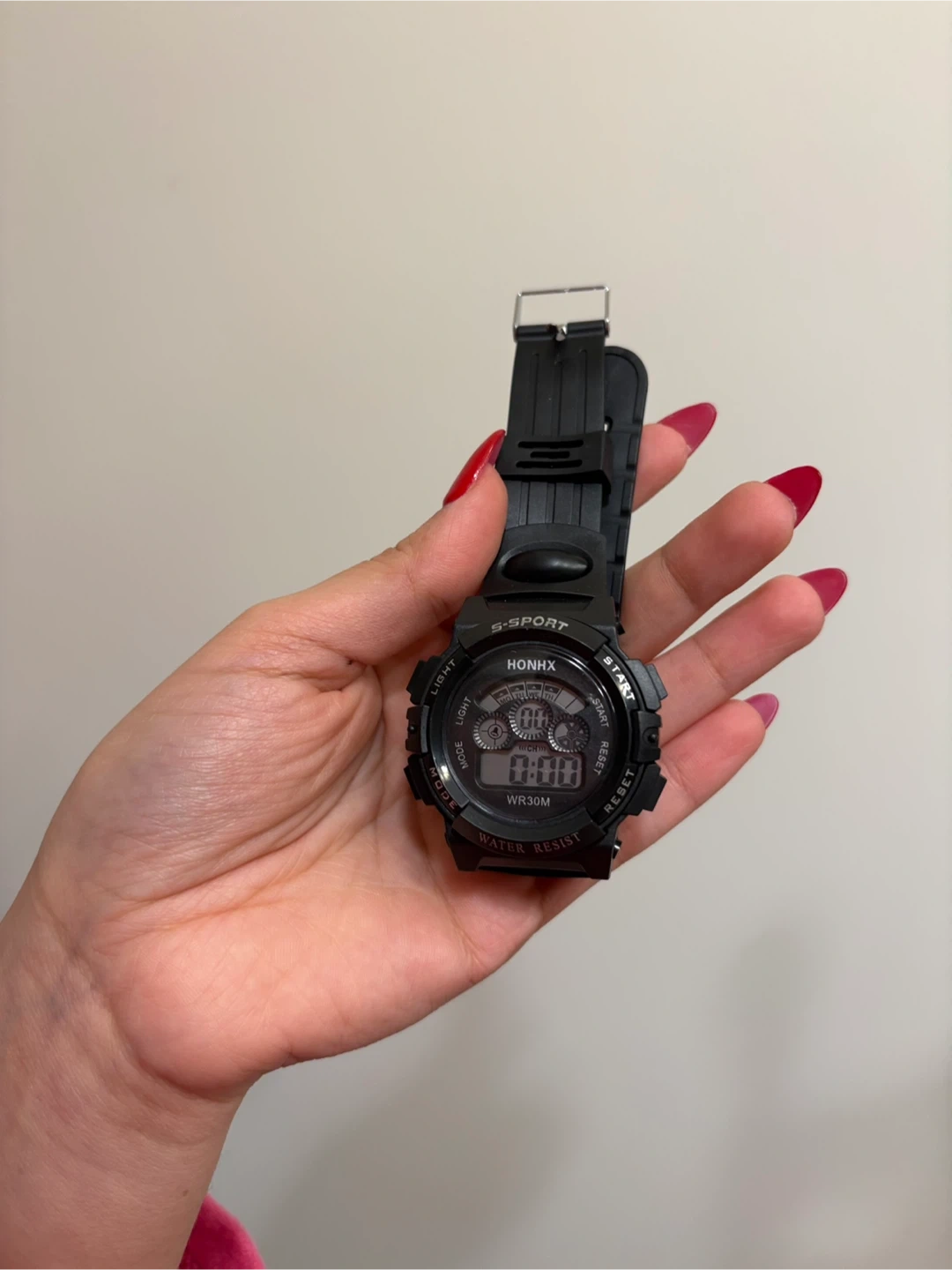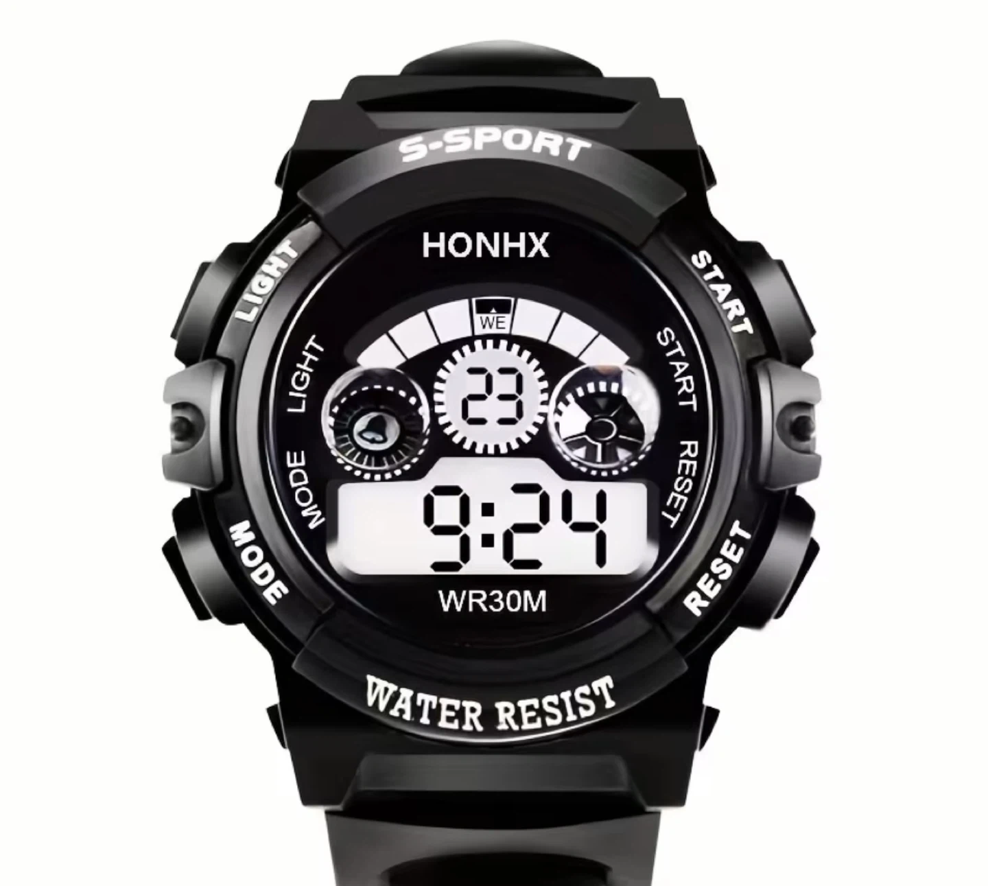 Selling a HONHX S-Sport digital watch in black! It's water-resistant up to 30m.