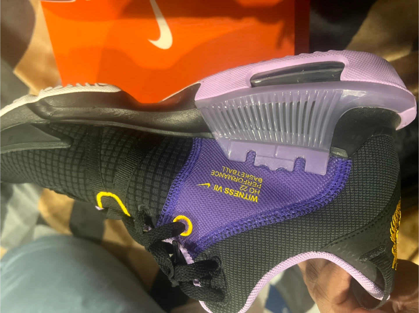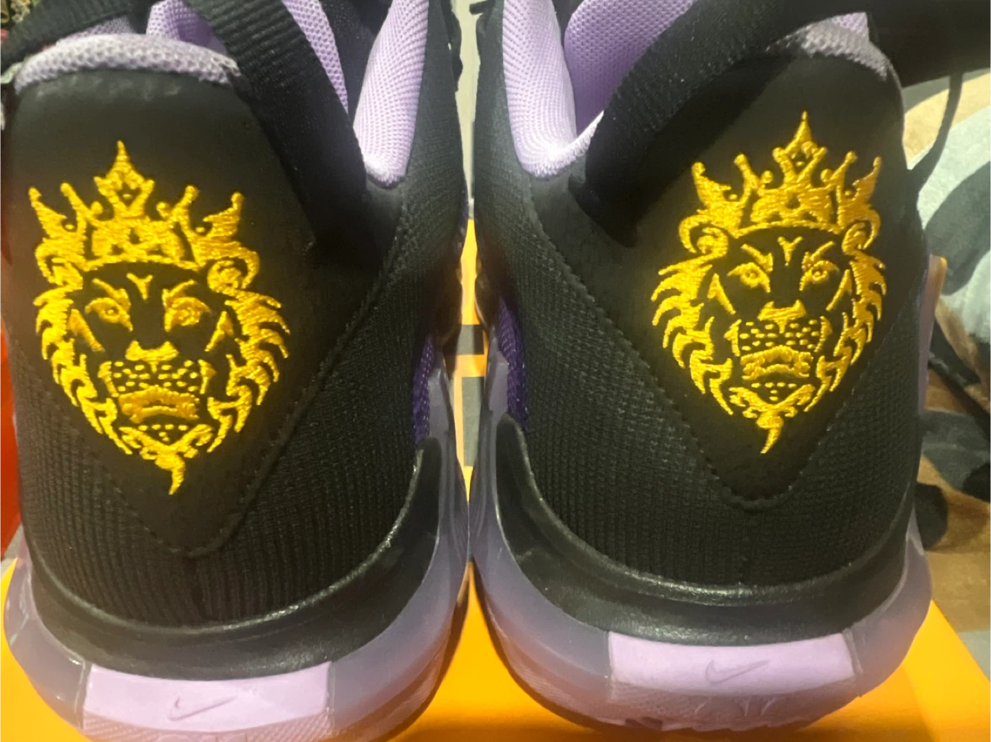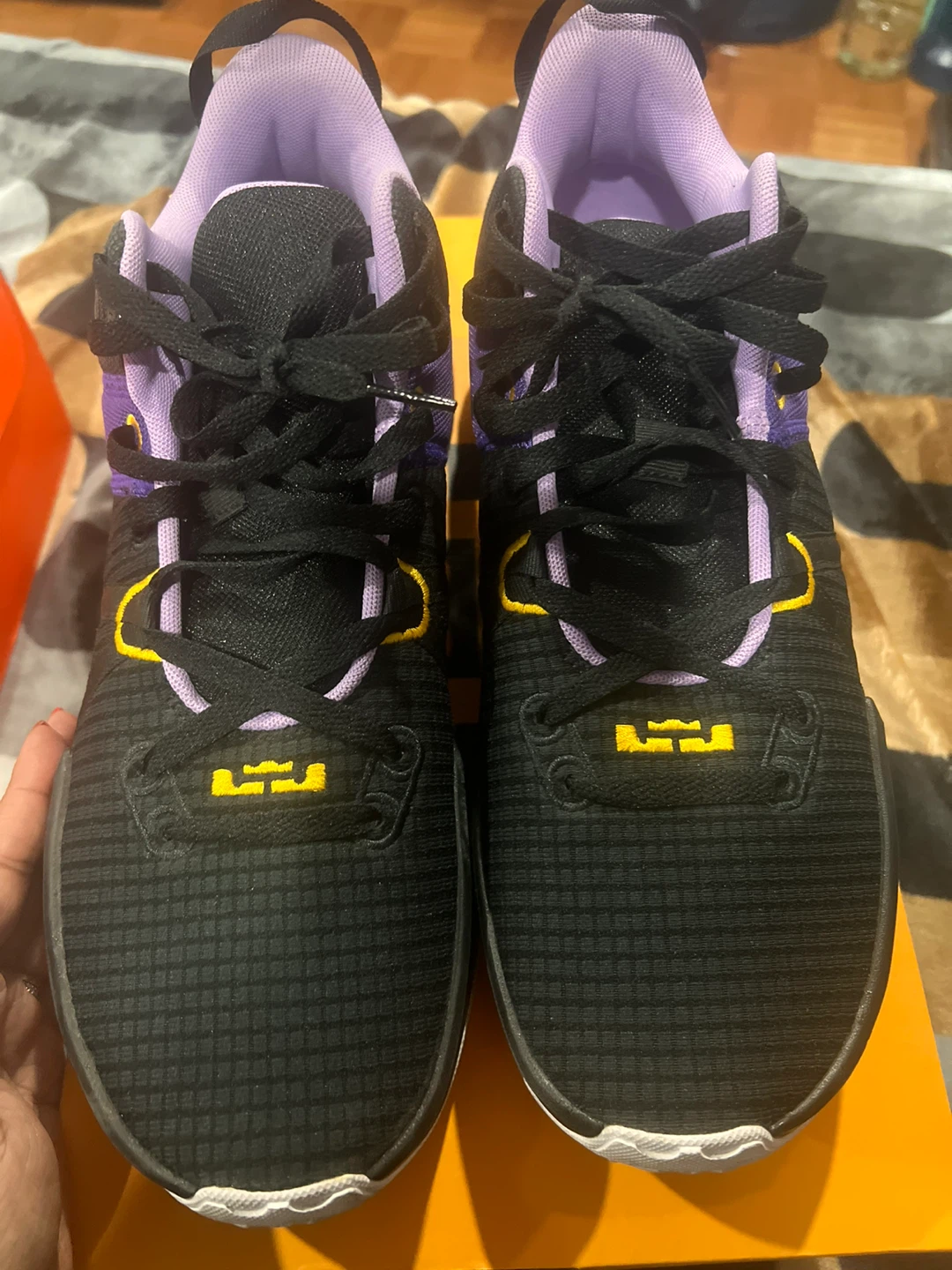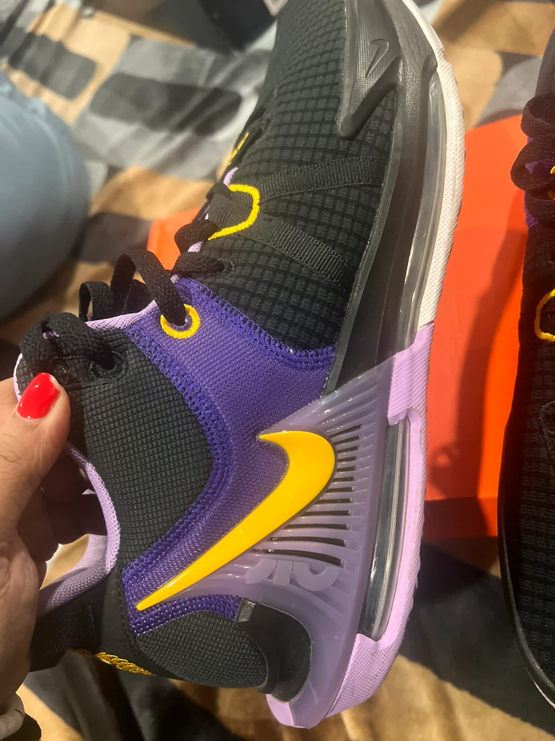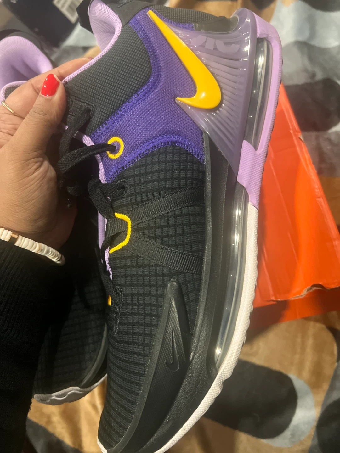 Selling a pair of Nike LeBron Witness VII basketball shoes in US size 11.5. They feature a black and purple colour scheme with a gold lion logo. The shoes come with the original box!