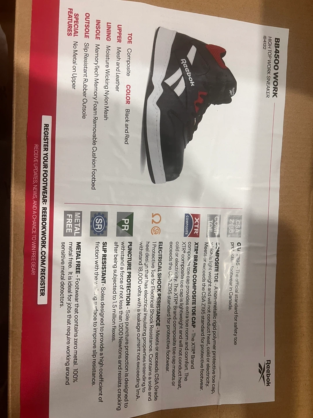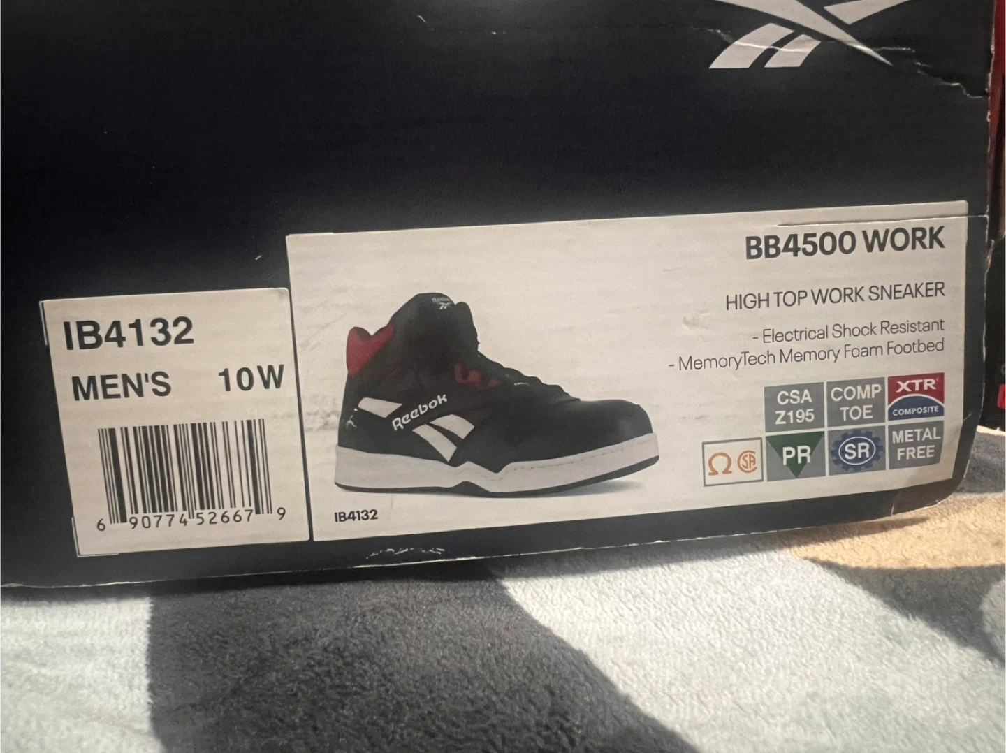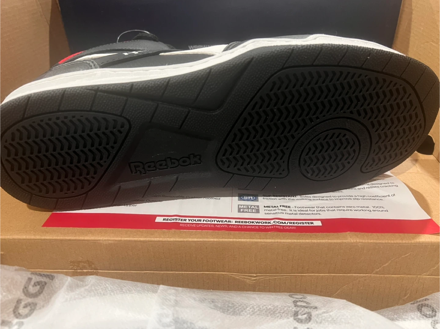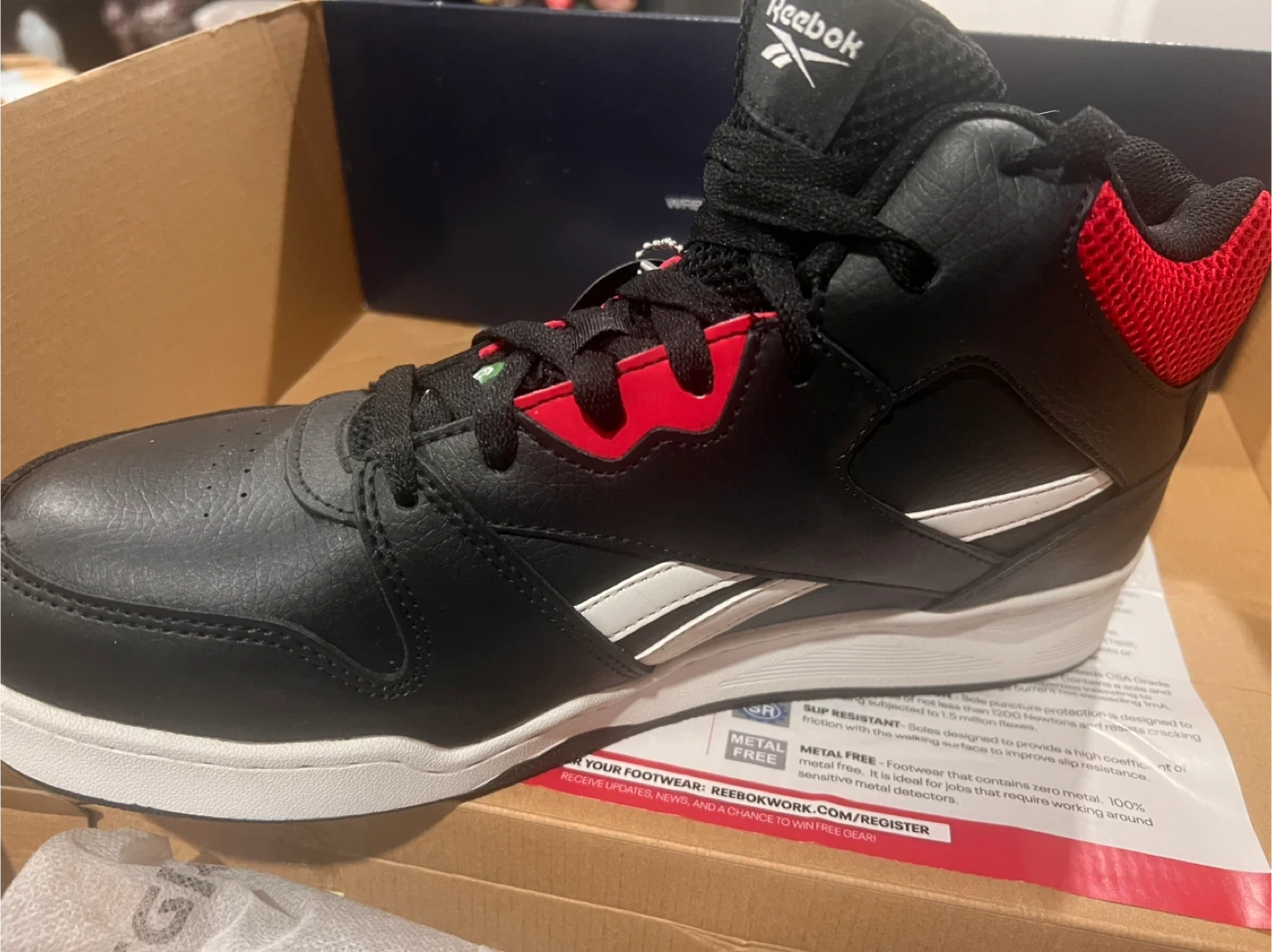 Selling a brand new pair of Reebok BB4500 Work high top sneakers in black and red! These are work sneakers with a composite toe and a slip-resistant rubber outsole. They are also metal and puncture resistant, and provide electrical shock resistance. Comes with the original box
