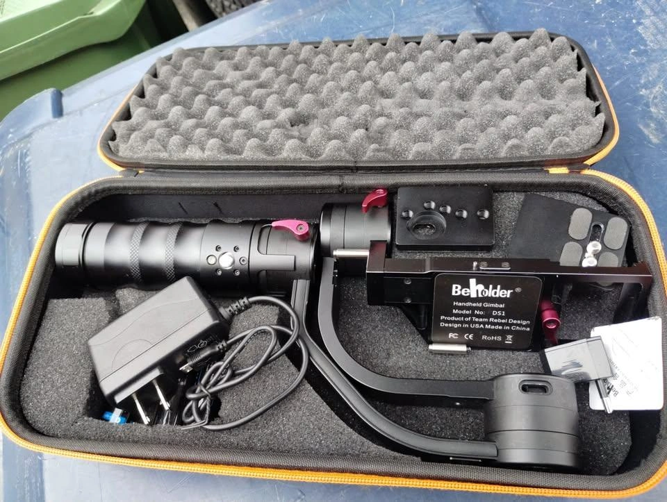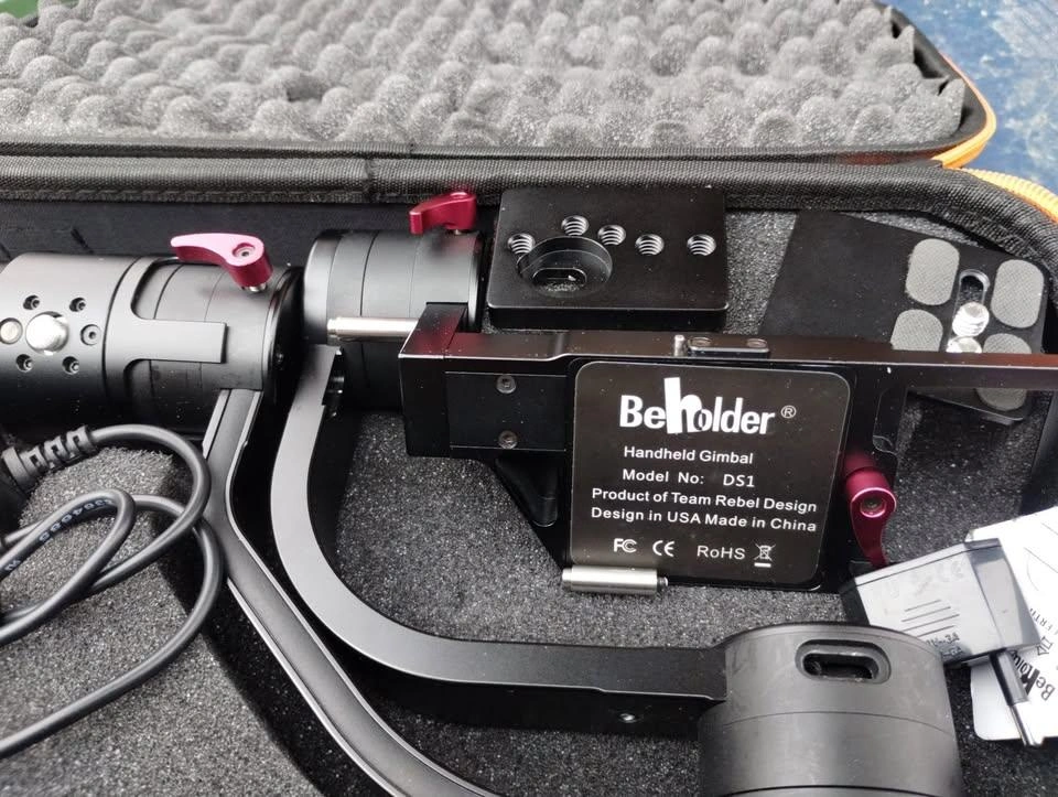 Beholder Handheld Gimbal Model No: DS1 - Great Condition The DS1 features four selectable stabilizing modes: follow, lock, inverted, and briefcase. Beyond just stabilizing, the DS1 allows you to adjust pan and tilt via a small joystick incorporated into the handgrip. It incorporates a USB port, which you can use to power a smal LED light, or charge your smartphone. The handle houses the three 2600mAh batteries, which can typically power the DS1 for approximately 2 to 3 hours. For smooth camera moves with most mirrorless and DSLR cameras. Equipped with 3-axis gyro-stabilized brushless motors to stabilize most mirrorless and DSLR cameras up to 3.7 pounds. The quick release plate acts as a sliding balance plate and allows you to quickly adjust the rig when you change lenses on the camera. Each axis features two adjustment locking levers that allow you to pre-adjust the position or balance your camera on the gimbal before turning it on. Modes Follow Mode stabilizes the camera and allows it to follow your movements as you pan and tilt. Lock Mode stabilizes the camera and holds in position even if you pan, tilt, or try to dutch-angle (off level the camera), until you reach the physical limit of the motor. You can hold and use the DS1 in normal, inverted, or briefcase mode. This allow you to get a wide variety of shots in a many different situations using one stabilizer. Illuminated on/off switch and battery indicator. 3/8"-16 tripod mount socket. AC Adapter with integrated Micro USB cable for charging. VIEW MY OTHER ADS!!!