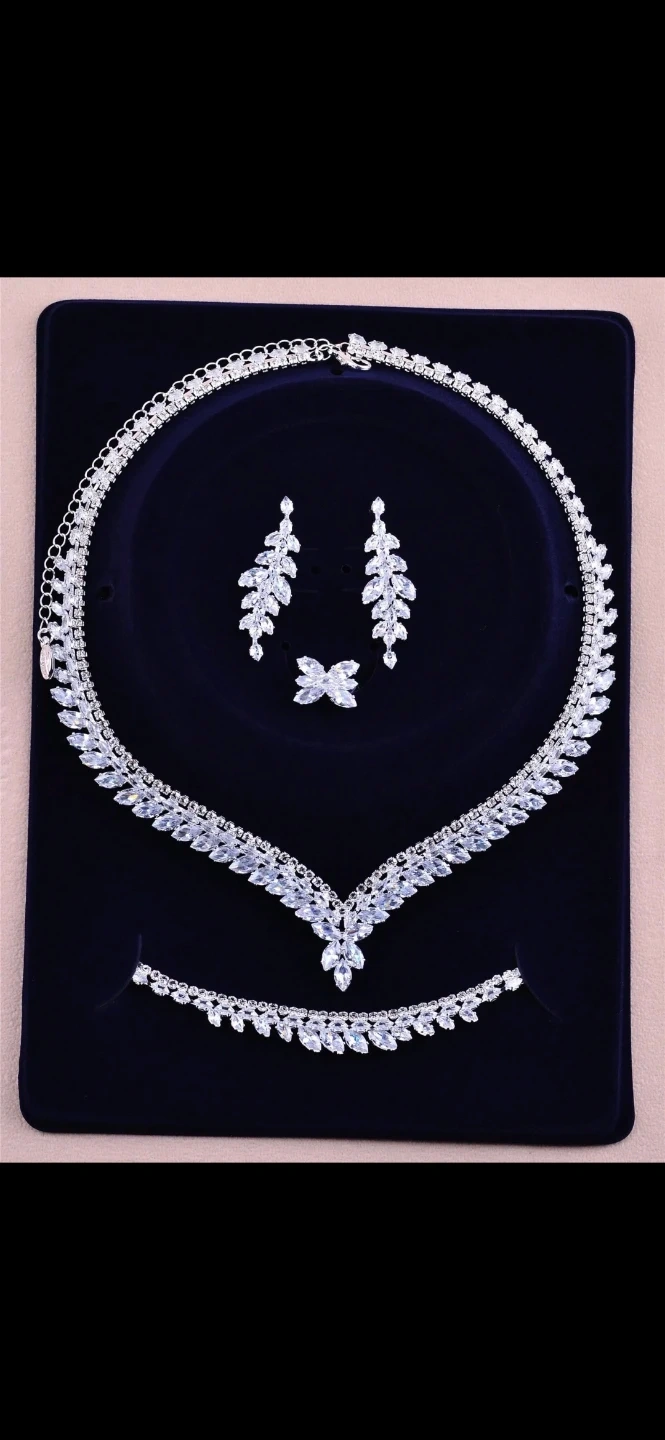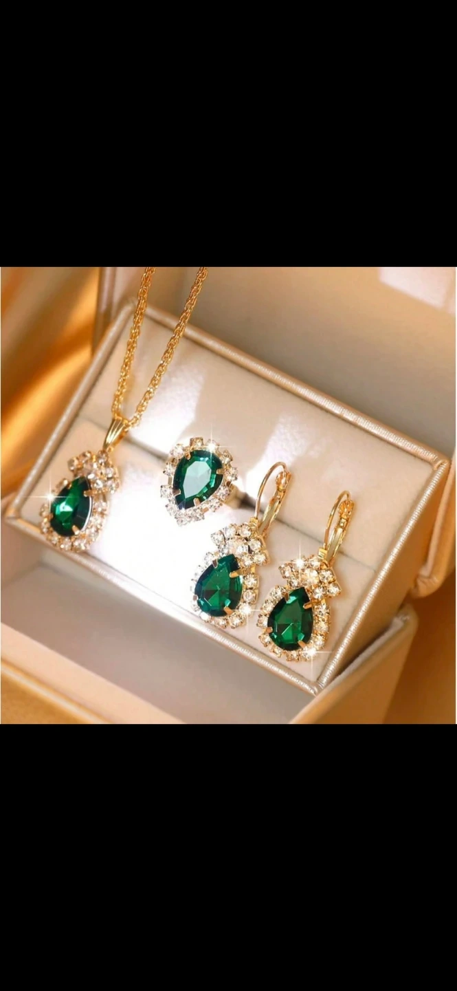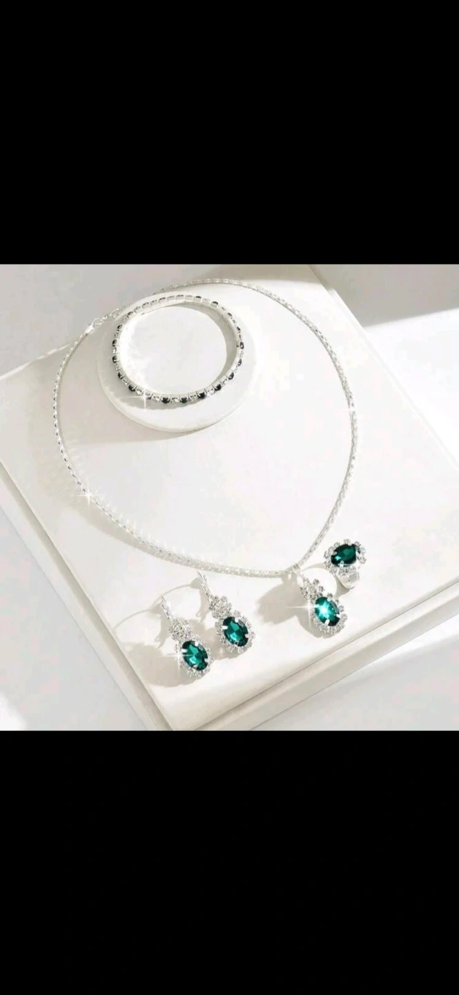 This is a beautiful jewellery sets that includes a necklace, earrings, and a ring. The set features green stones and clear stones.