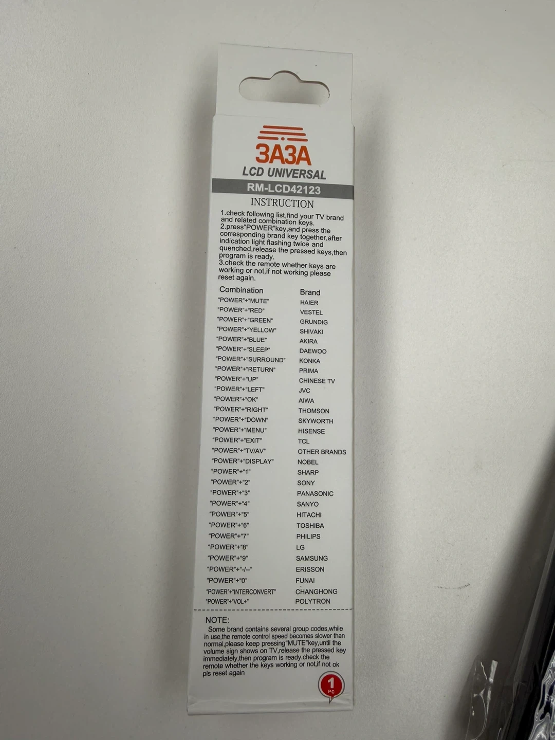 Selling a brand new 3A3A universal LCD remote, model RM-LCD42123! It's still in its original packaging and ready to use for LCD/LED TVs. The box includes instructions for programming to various TV brands. It's made with new ABS material for durability