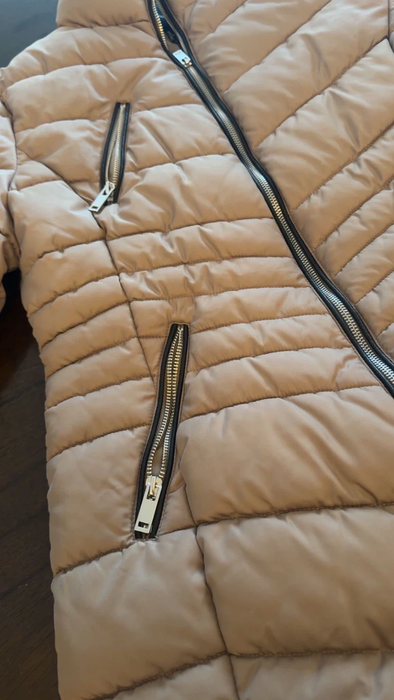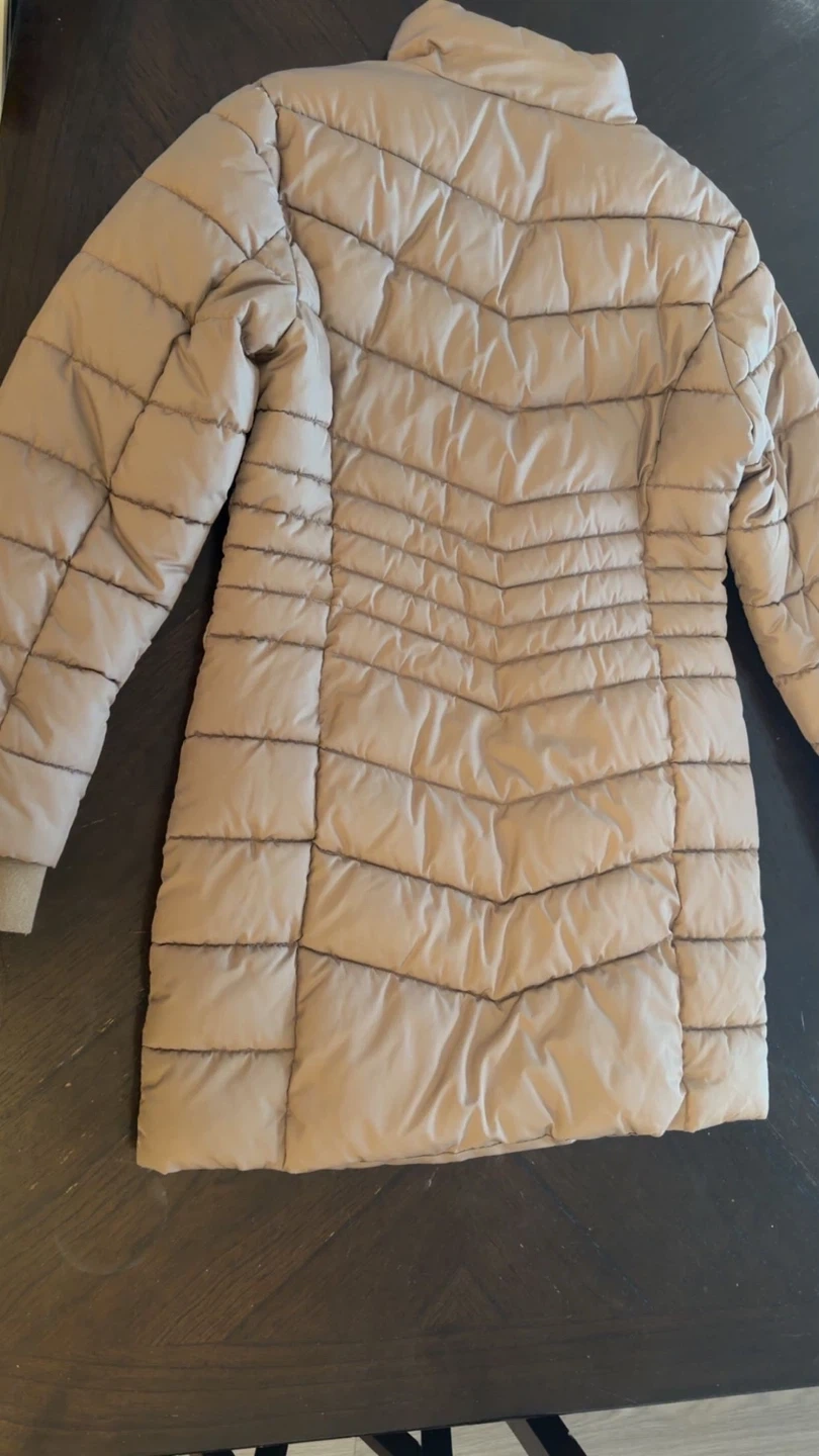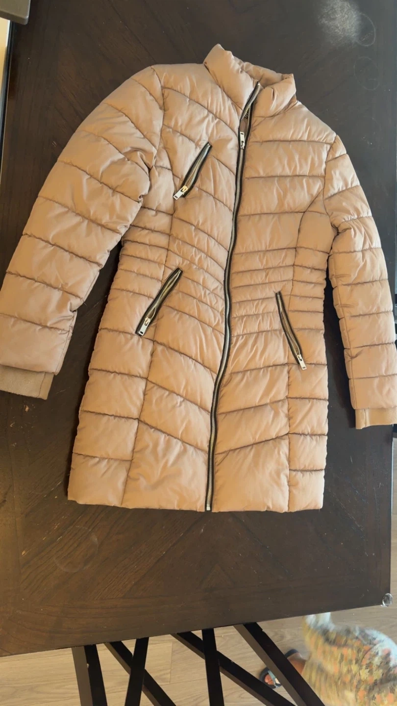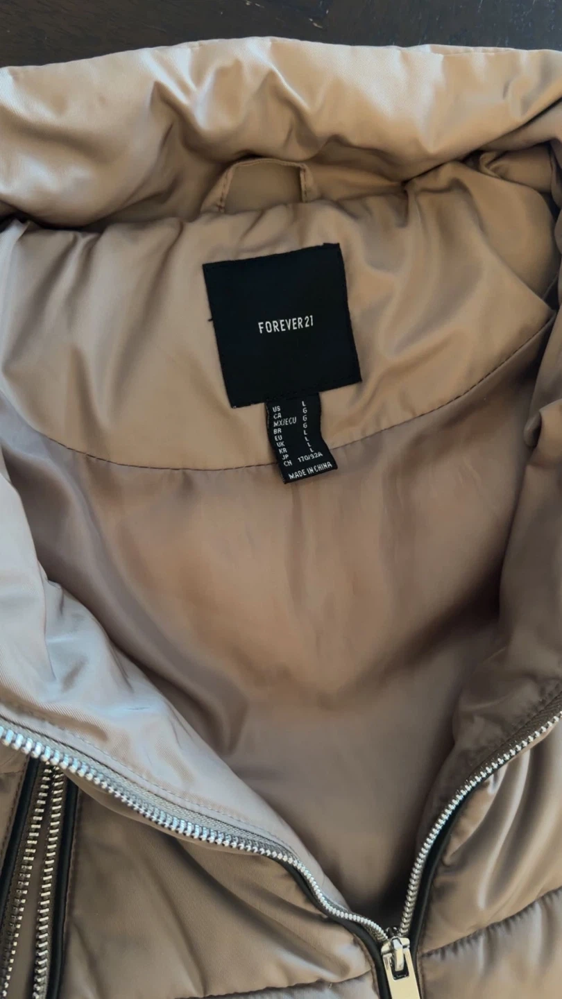 Cozy Forever 21 puffer jacket in a neutral colour! It's a size large and has a stylish quilted design with zipper details. Perfect for staying warm during those chilly Canadian days!
