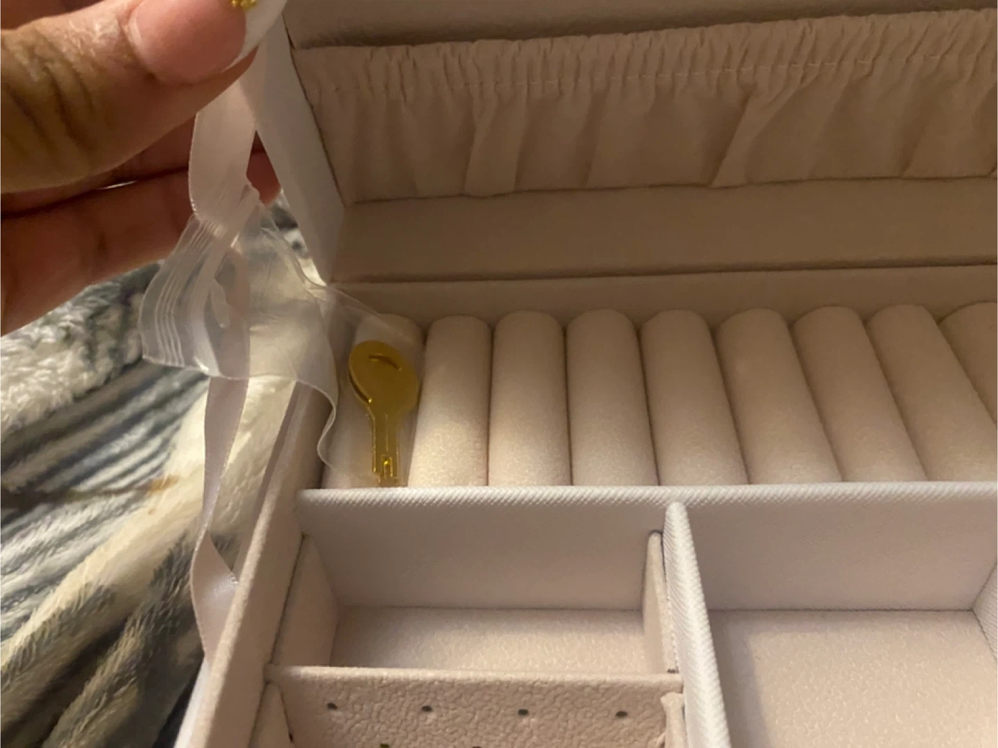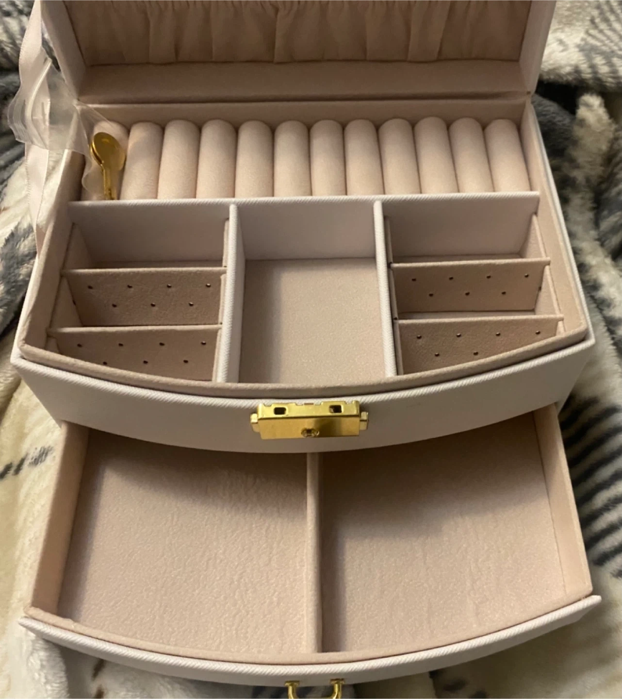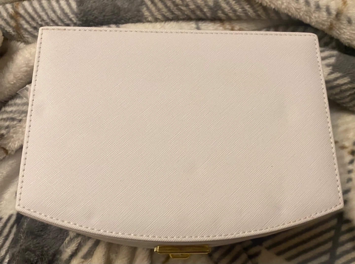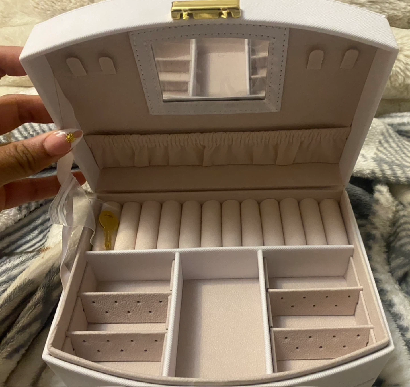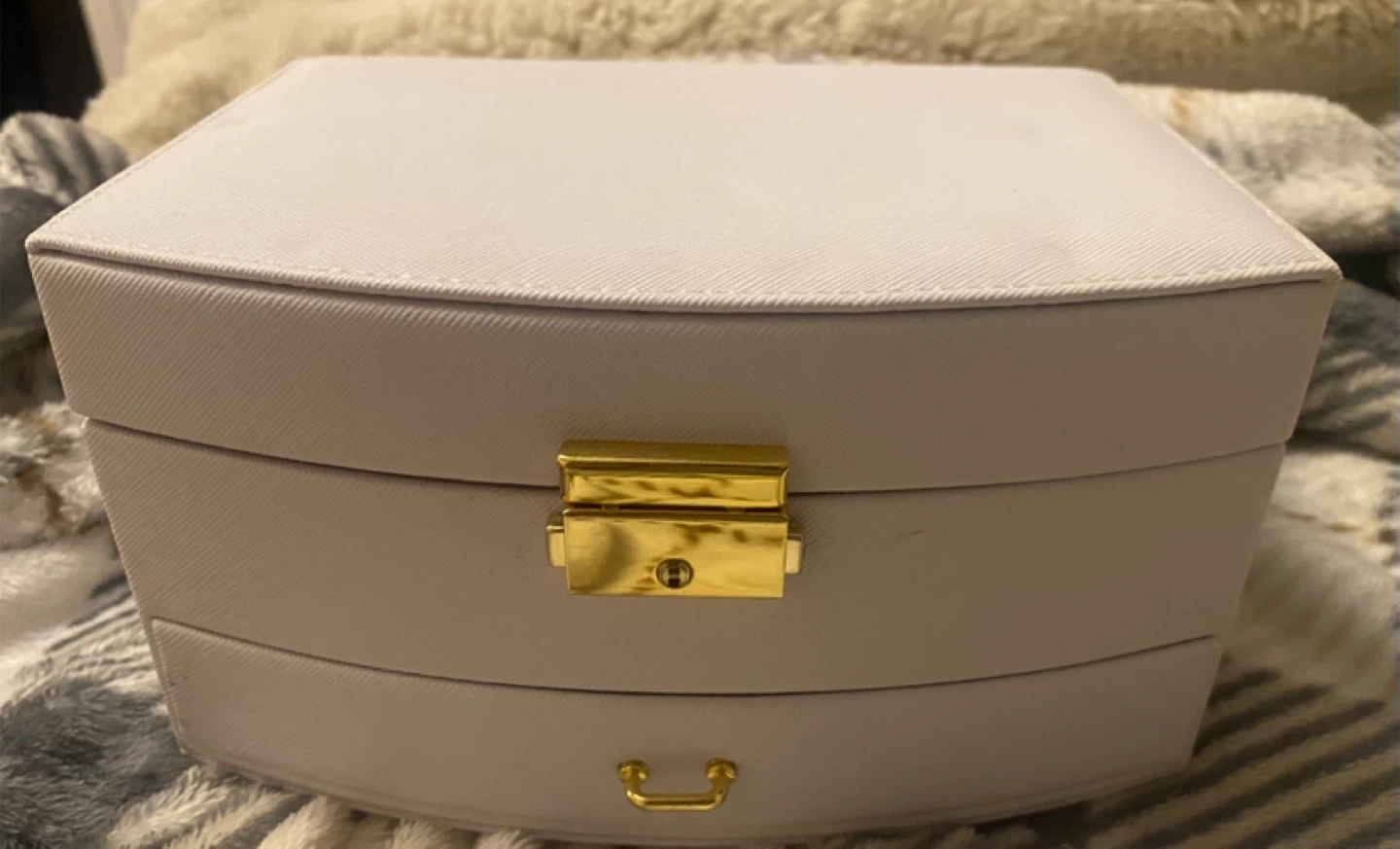 Selling a lovely white jewellery box! It comes with a little golden key to keep your treasures safe. The inside has lots of compartments for rings, necklaces, and more. It’s never been used and in great shape!