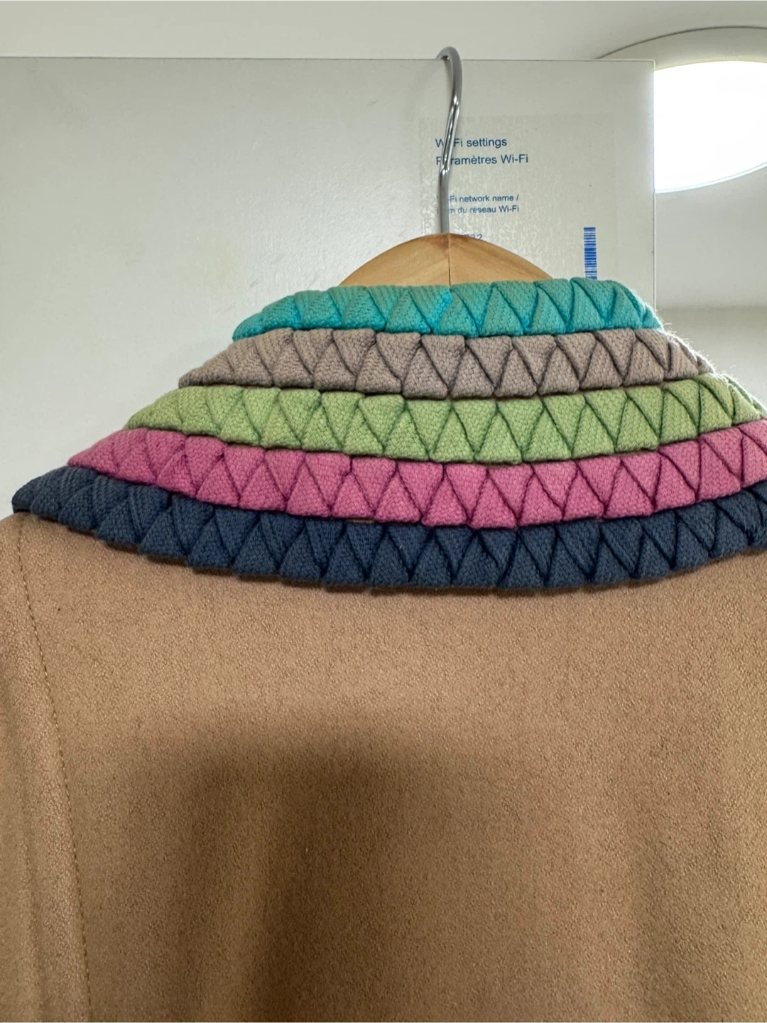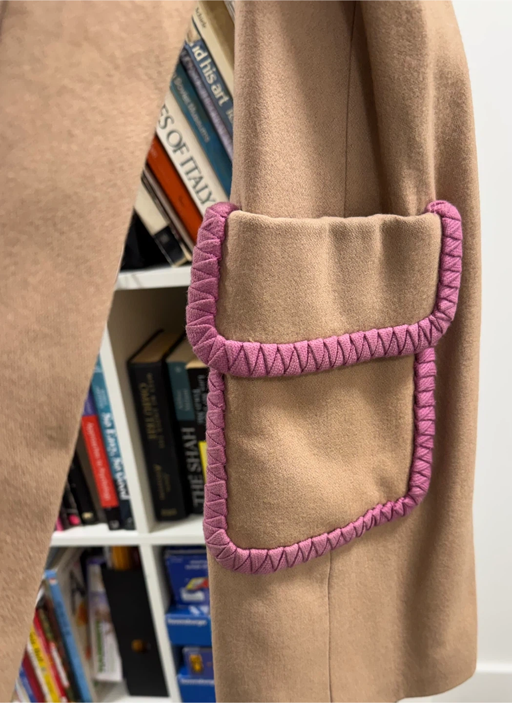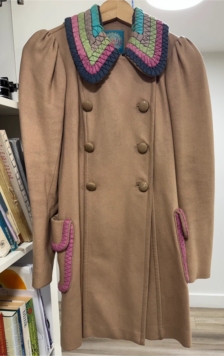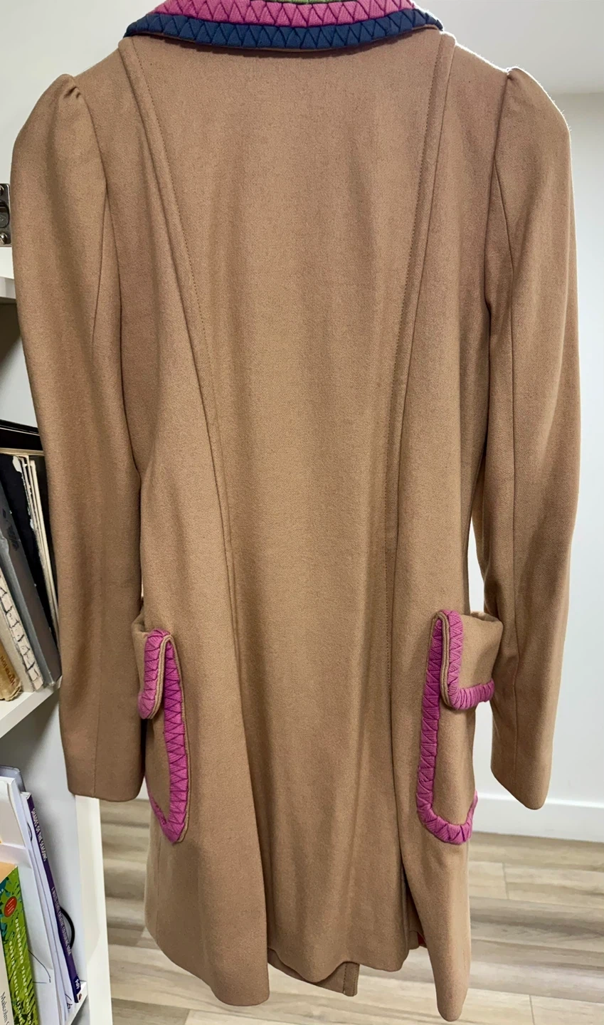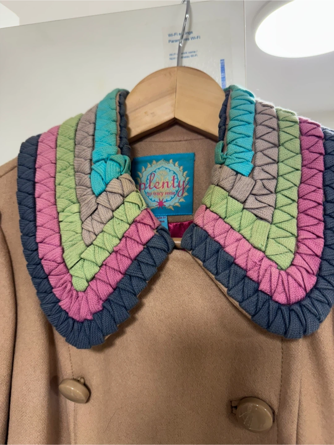 Selling a gently used Plenty by Tracy Reese coat! It's a lovely tan colour with unique detailing around the collar and pockets. The coat is made from a wool blend and has a double-breasted design. Perfect for adding a touch of whimsy to your wardrobe!