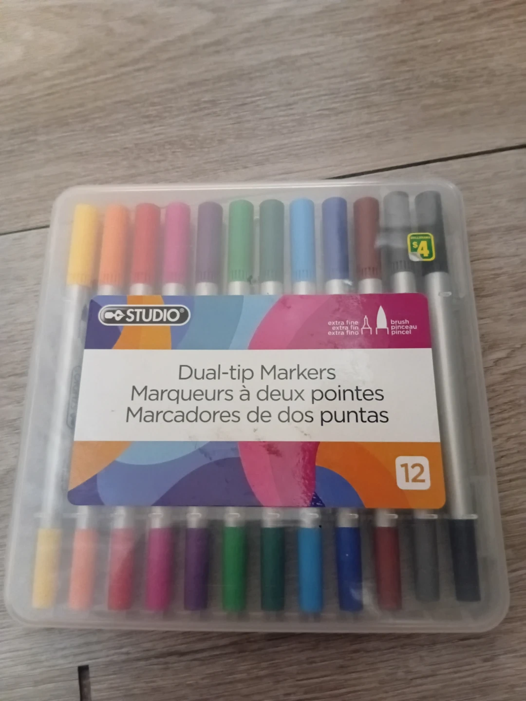 Selling a set of Studio Dual-tip Markers! This pack comes with 12 markers, each featuring an extra fine tip on one end and a brush tip on the other. Perfect for all your creative projects!
