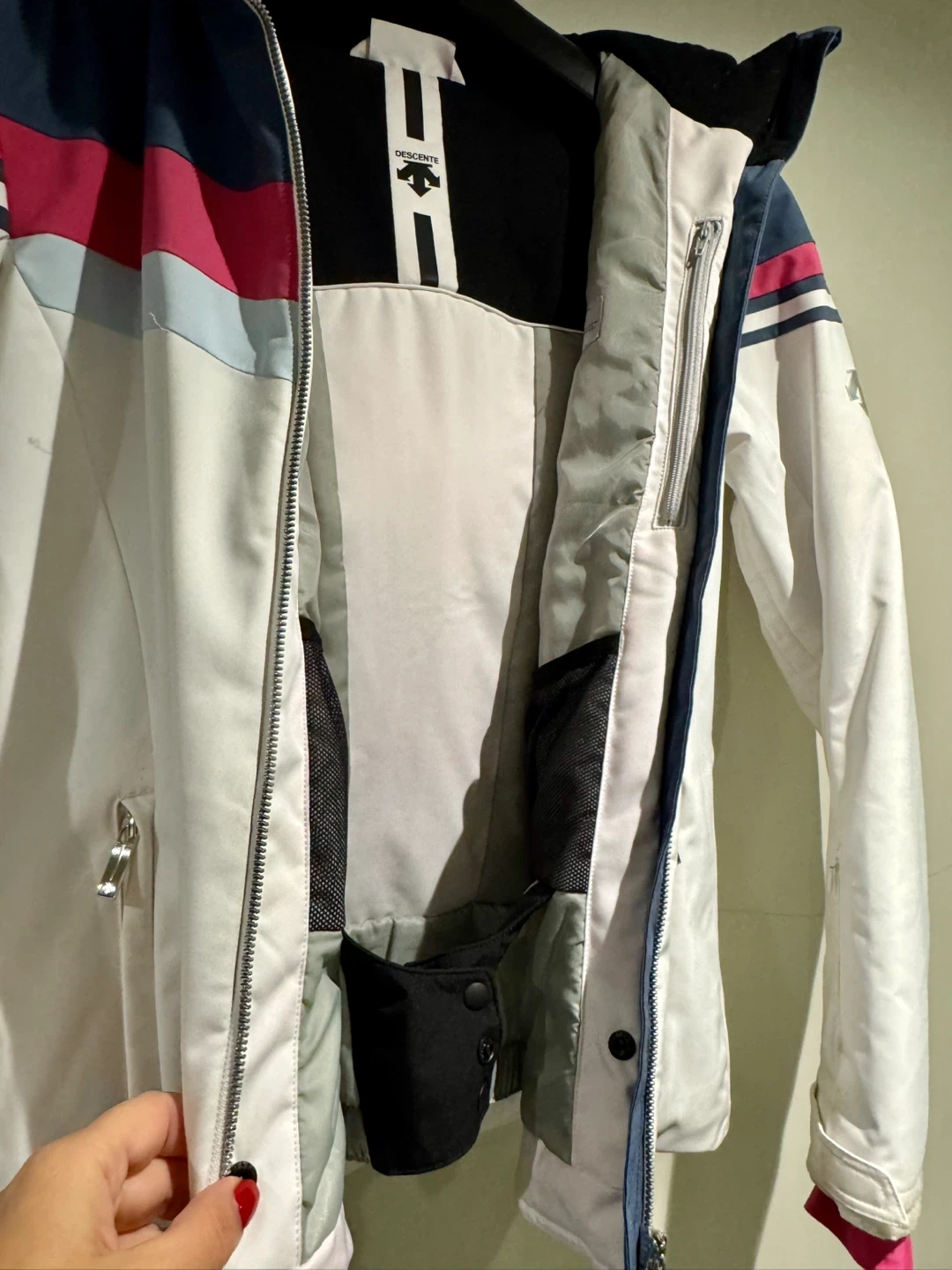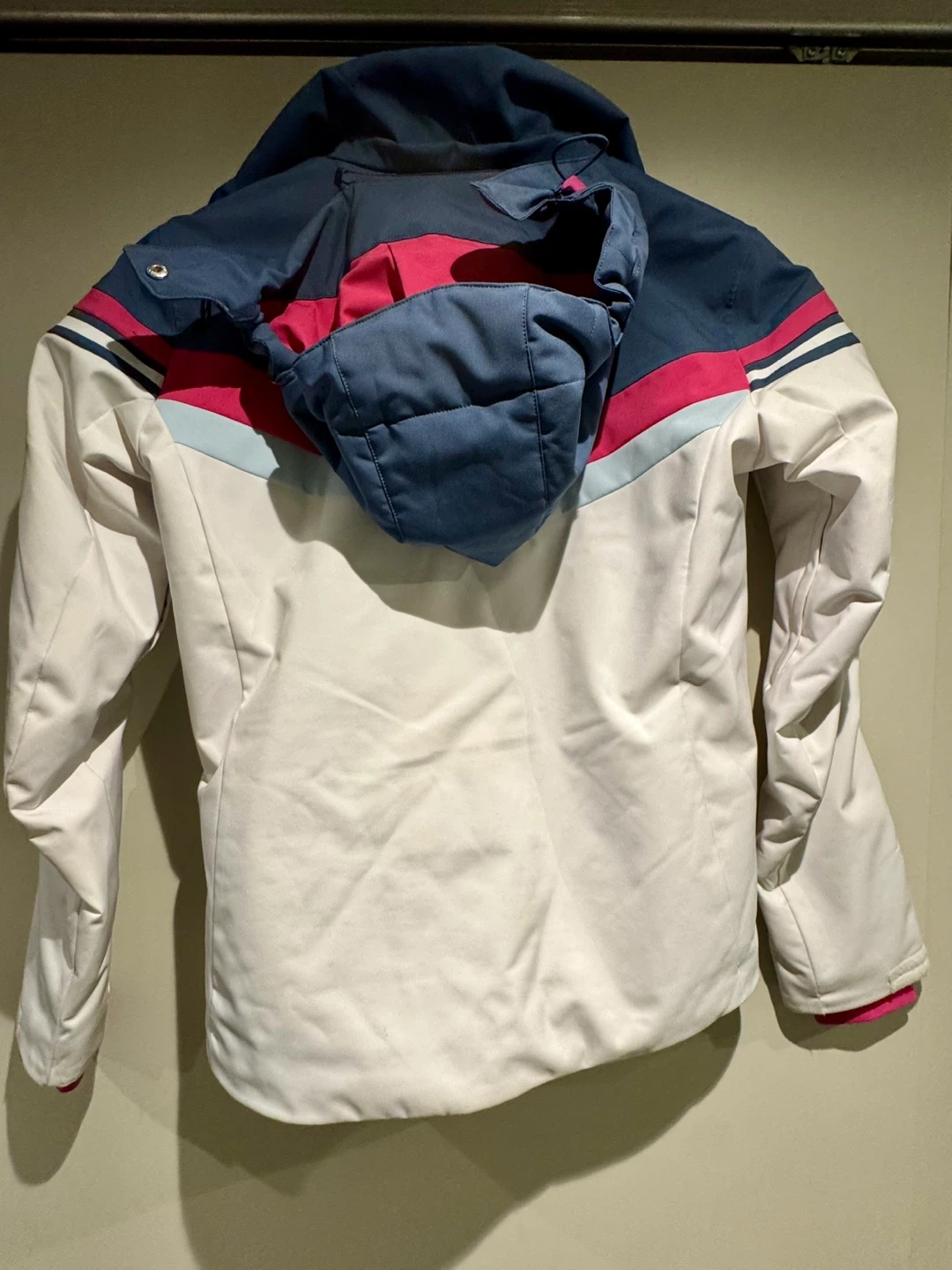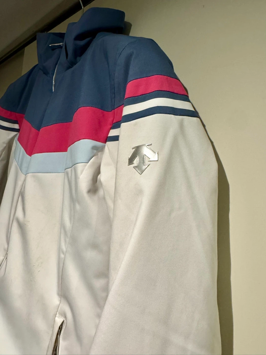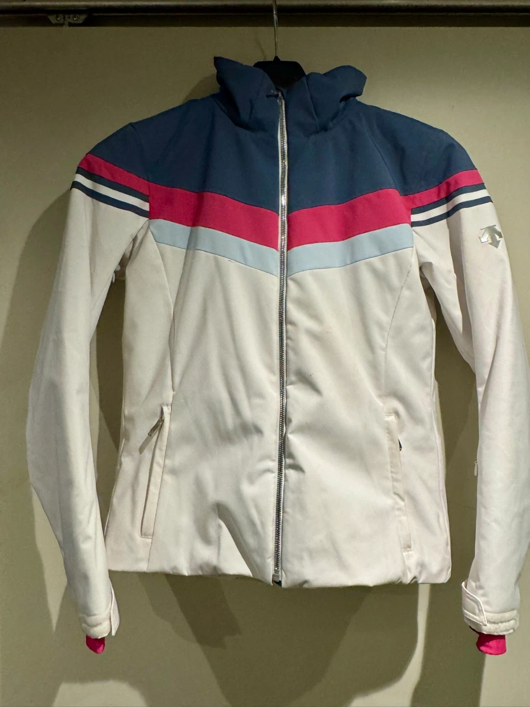 Selling a Descente ski jacket in good condition! It features a stylish design with white, blue, and pink accents. Perfect for hitting the slopes this winter!