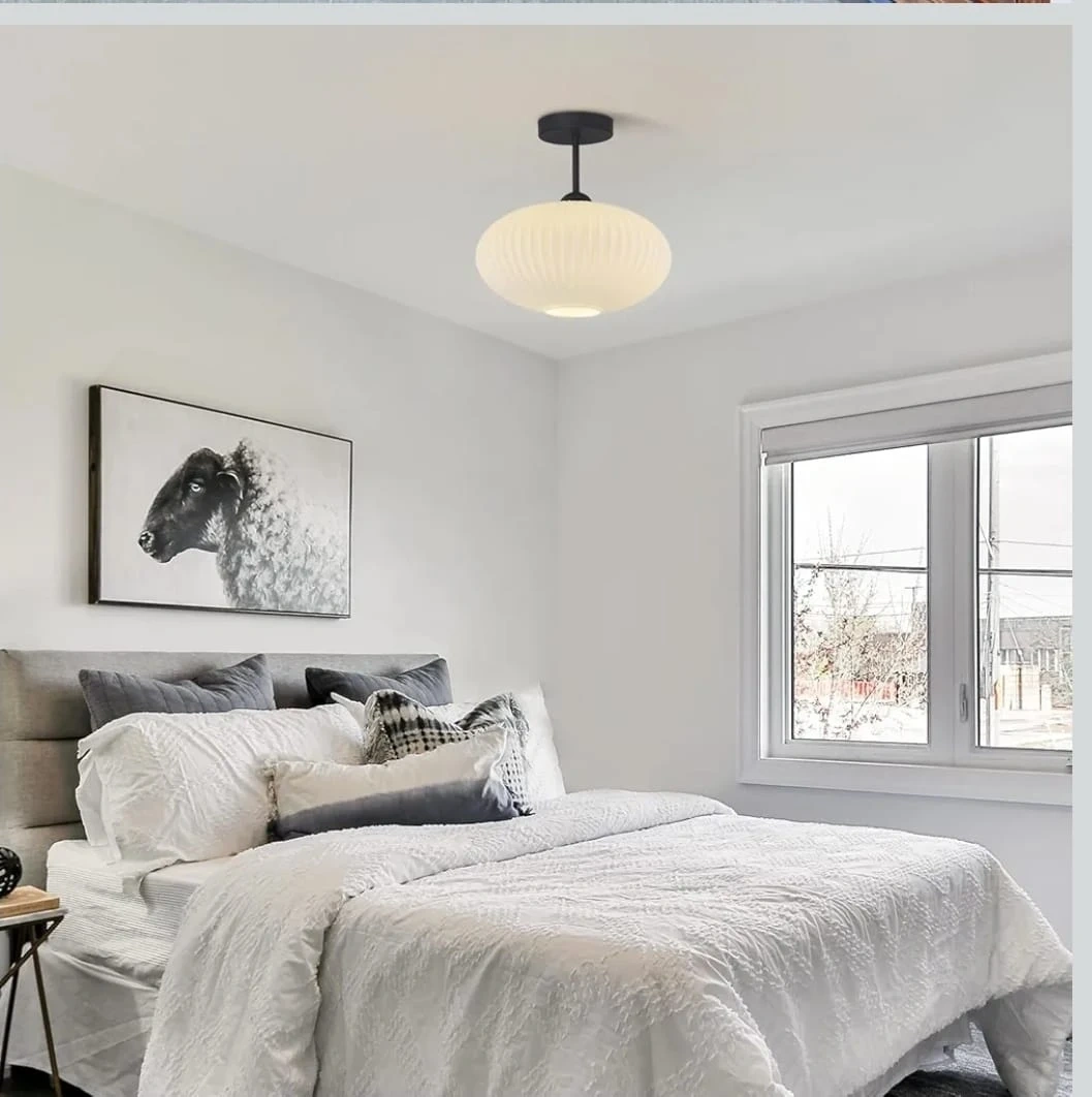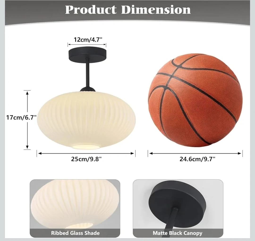 Selling a ceiling light with a ribbed glass shade! It has a matte black canopy and the dimensions are approximately 25cm/9.8" wide and 17cm/6.7" high. The canopy is 12cm/4.7". Comes with the original box