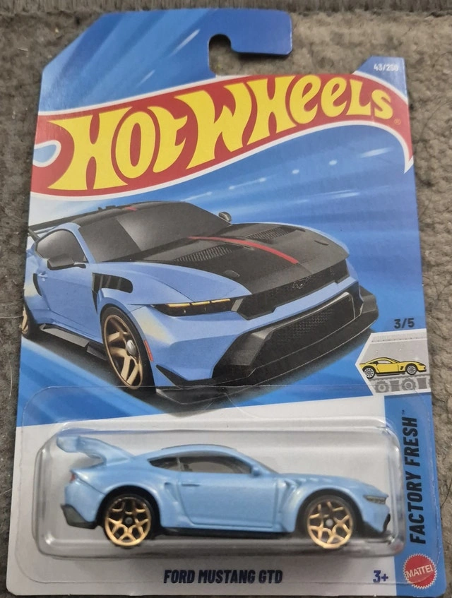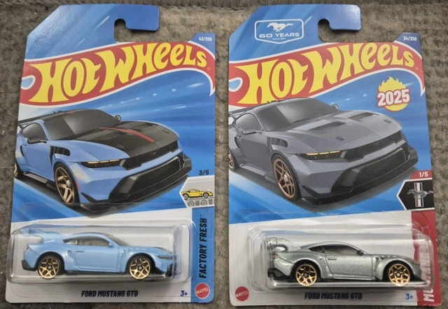 Ford Mustang GTD Collection: 2025 Hot Wheels Mainline Series: Mustang 60th Colour: Grey Description: Detailed headlights and taillights I also have the 2026 HW version in Holographic Blue with a red stripe on the hood (black) and roof Asking for $5 or best offer. I am looking only to sell one to keep the other. However, I am willing to get them go as a pair for $11 If the ad is still up, it is available. Check out my other ads