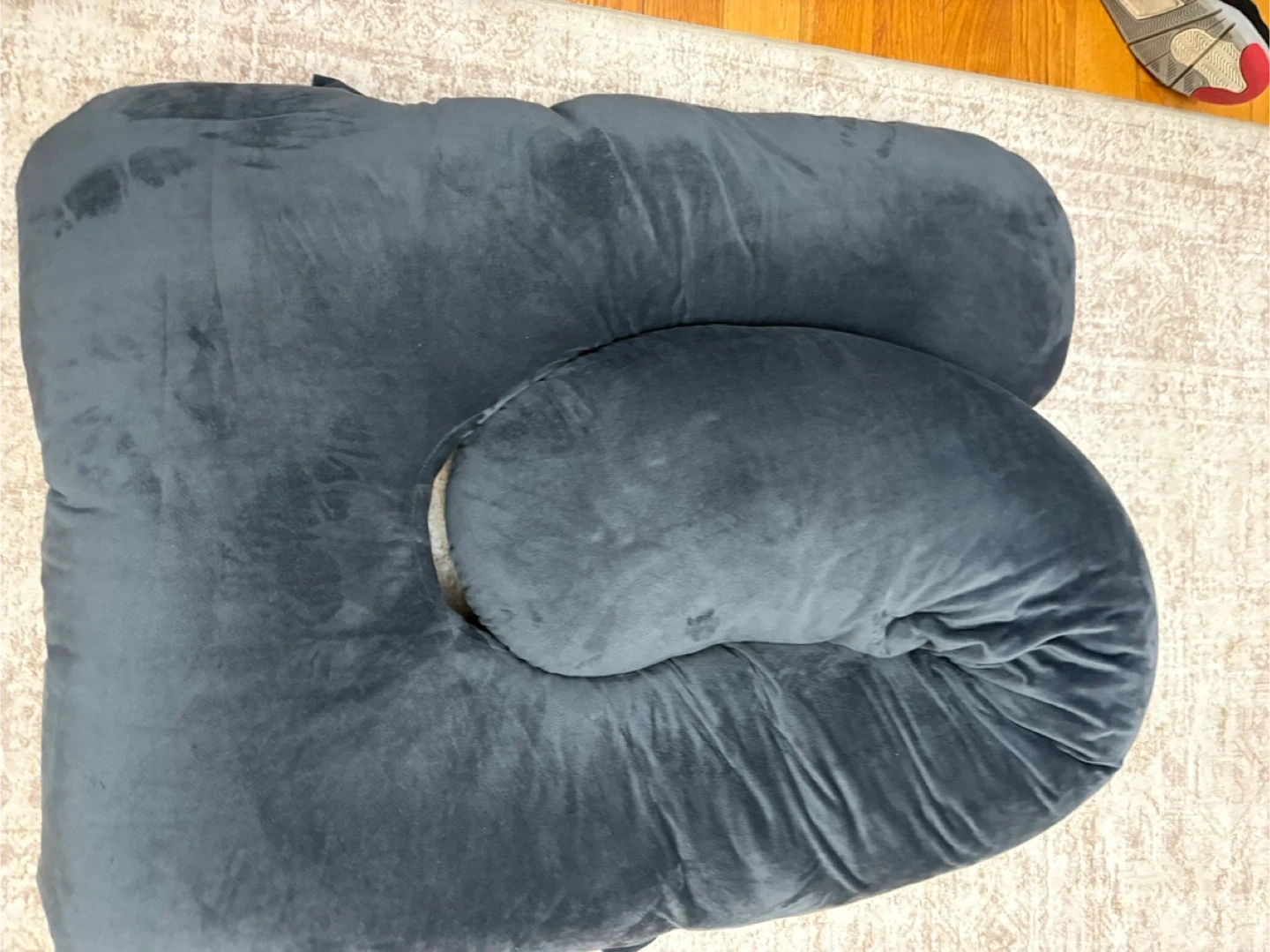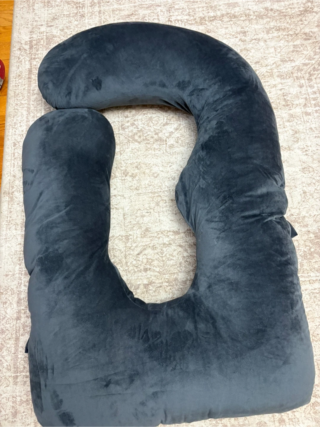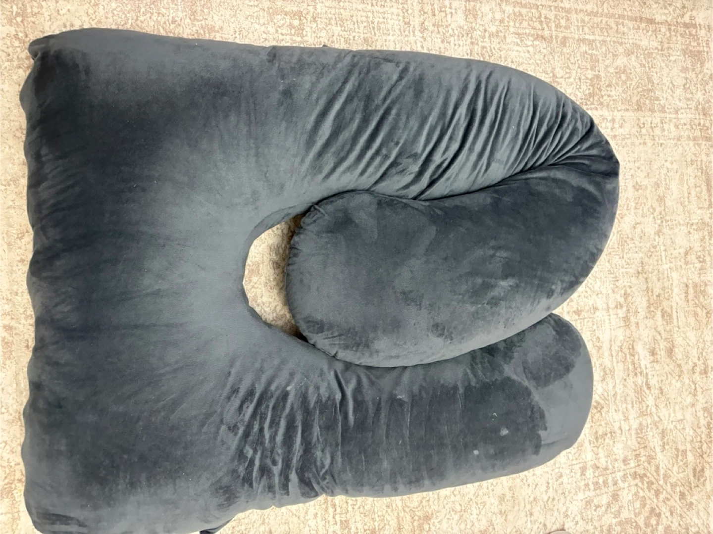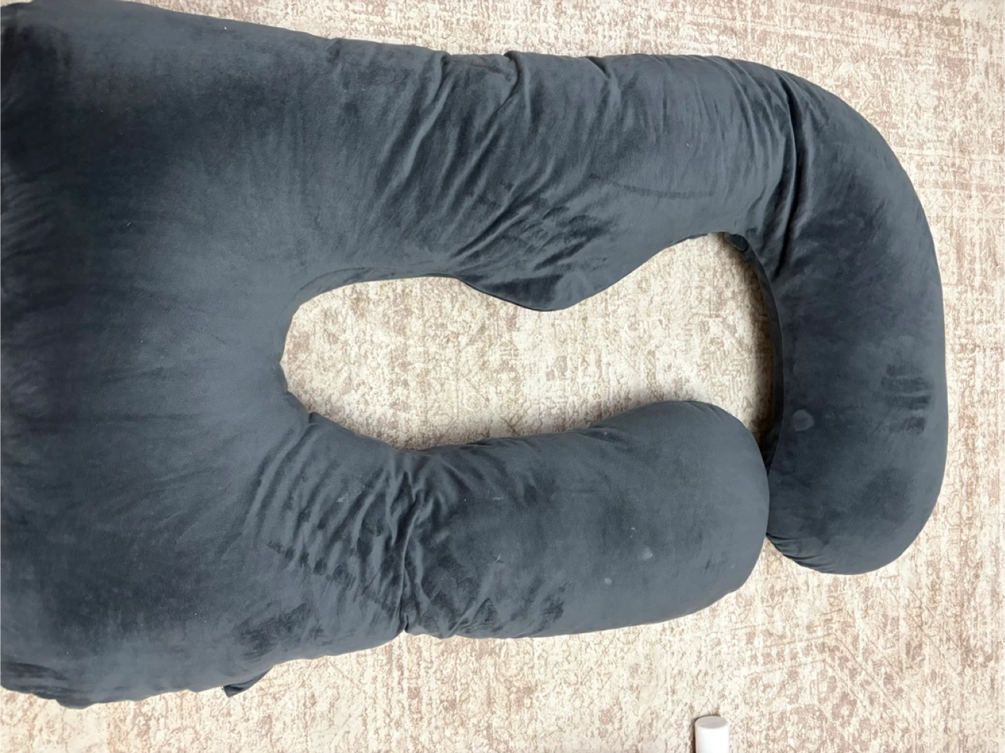 This is a U-shaped full body pregnancy pillow in gray. It looks like it's in great condition and ready to provide comfort and support during pregnancy