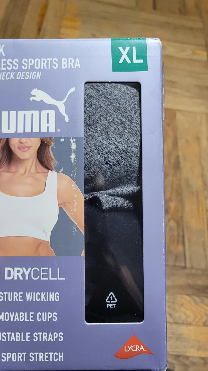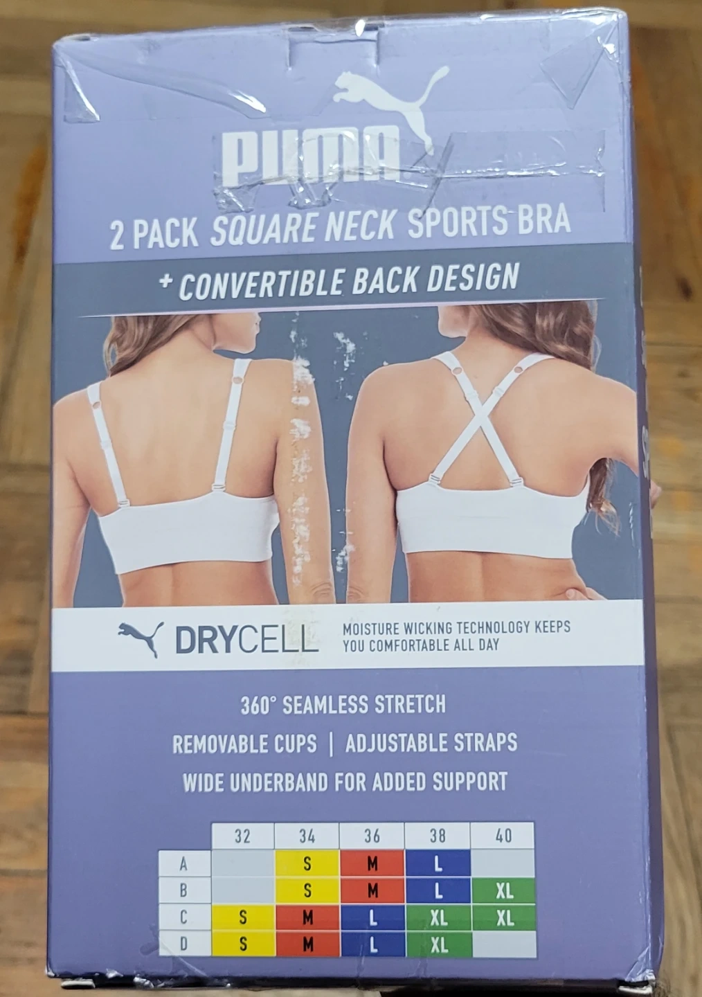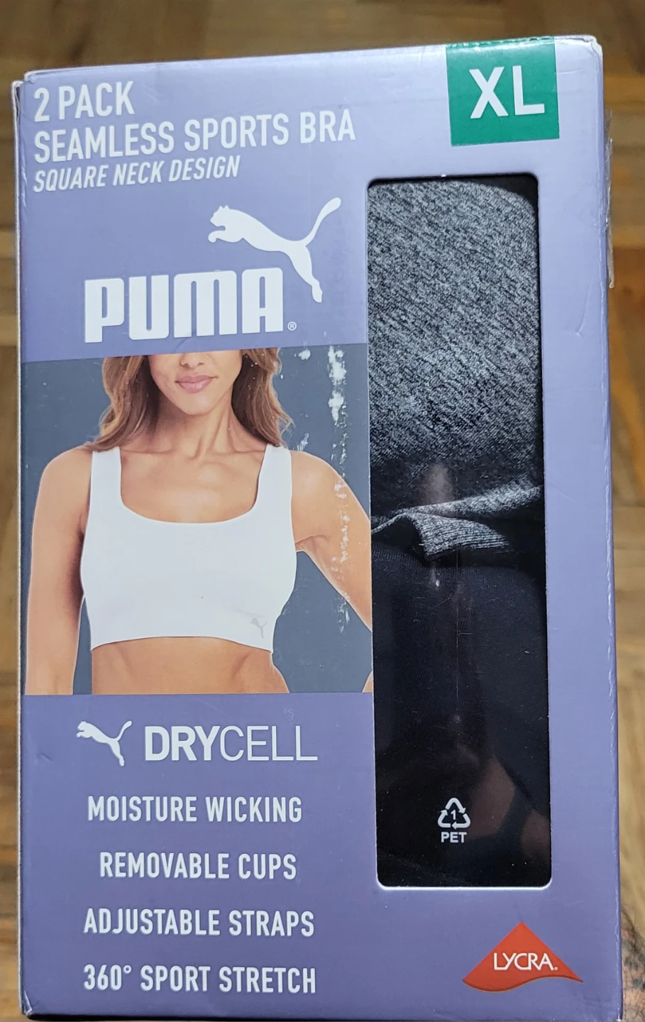 Selling a brand new Puma 2 pack square neck sports bra in size XL. Features Drycell moisture wicking technology, removable cups, and adjustable straps. The bra has a 360° seamless stretch and wide underband for added support