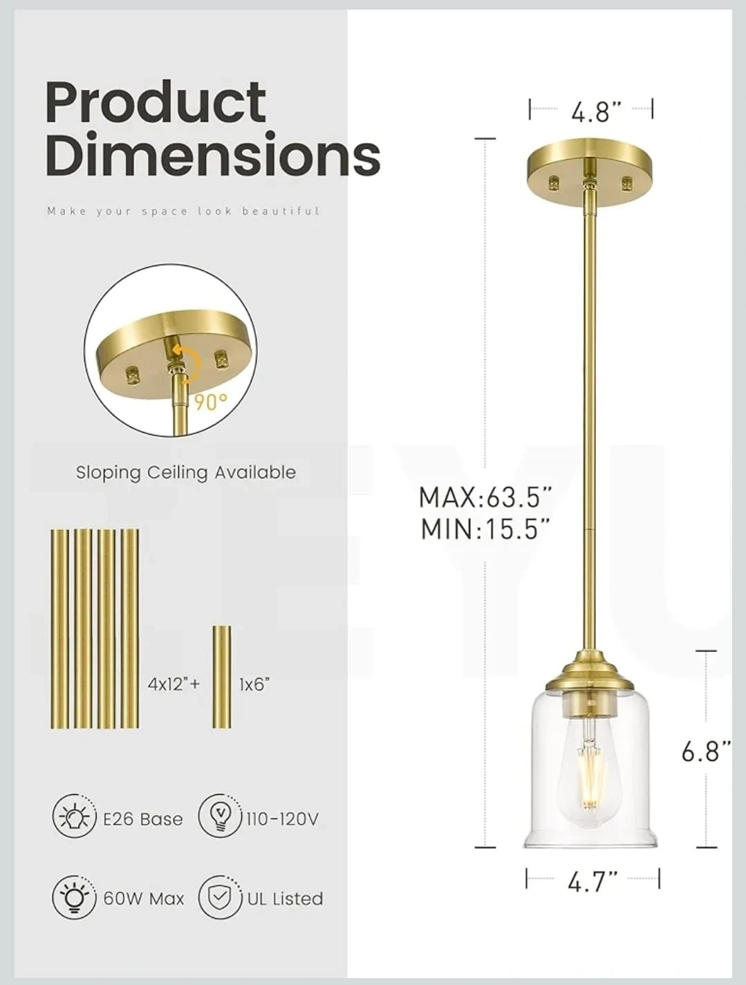 Add a touch of elegance to your space with this gold pendant lighting fixture! It comes with all the components needed for installation, including the rods and glass cover. The fixture has a maximum height of 63.5 inches and a minimum height of 15.5 inches. The base is E26 and supports 110-120V with a 60W Max bulb. Perfect for creating a warm and inviting atmosphere in any room!
