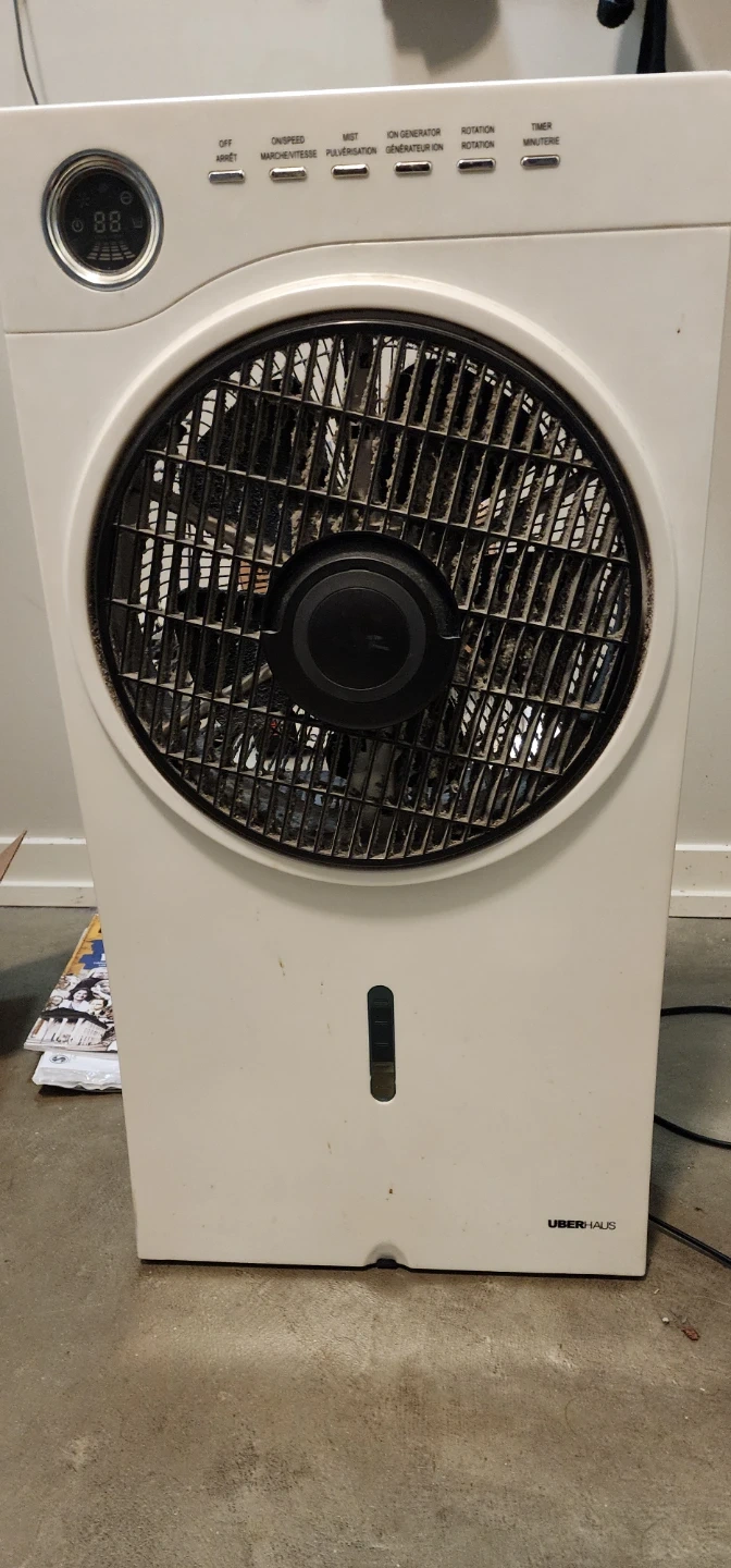 Selling an Uberhaus air cooler. It has settings for speed, mist, ion generation, and rotation. It also has a timer function. Needs a bit of dusting but otherwise clean and works
