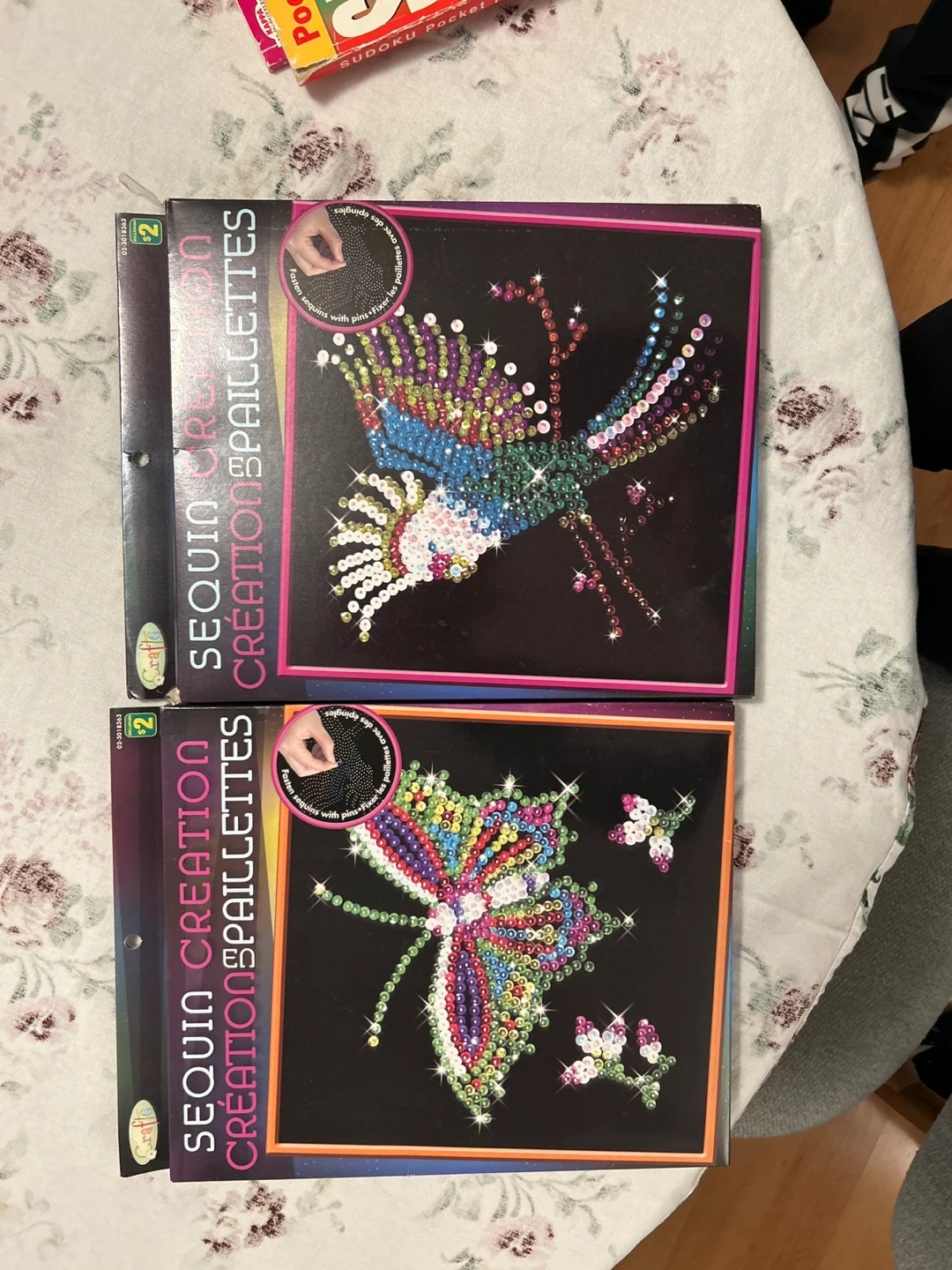 One features a beautiful butterfly design, and a colourful bird. Perfect for a fun and creative project. Each kit comes with everything you need to fasten sequins with pins to create sparkling artwork!