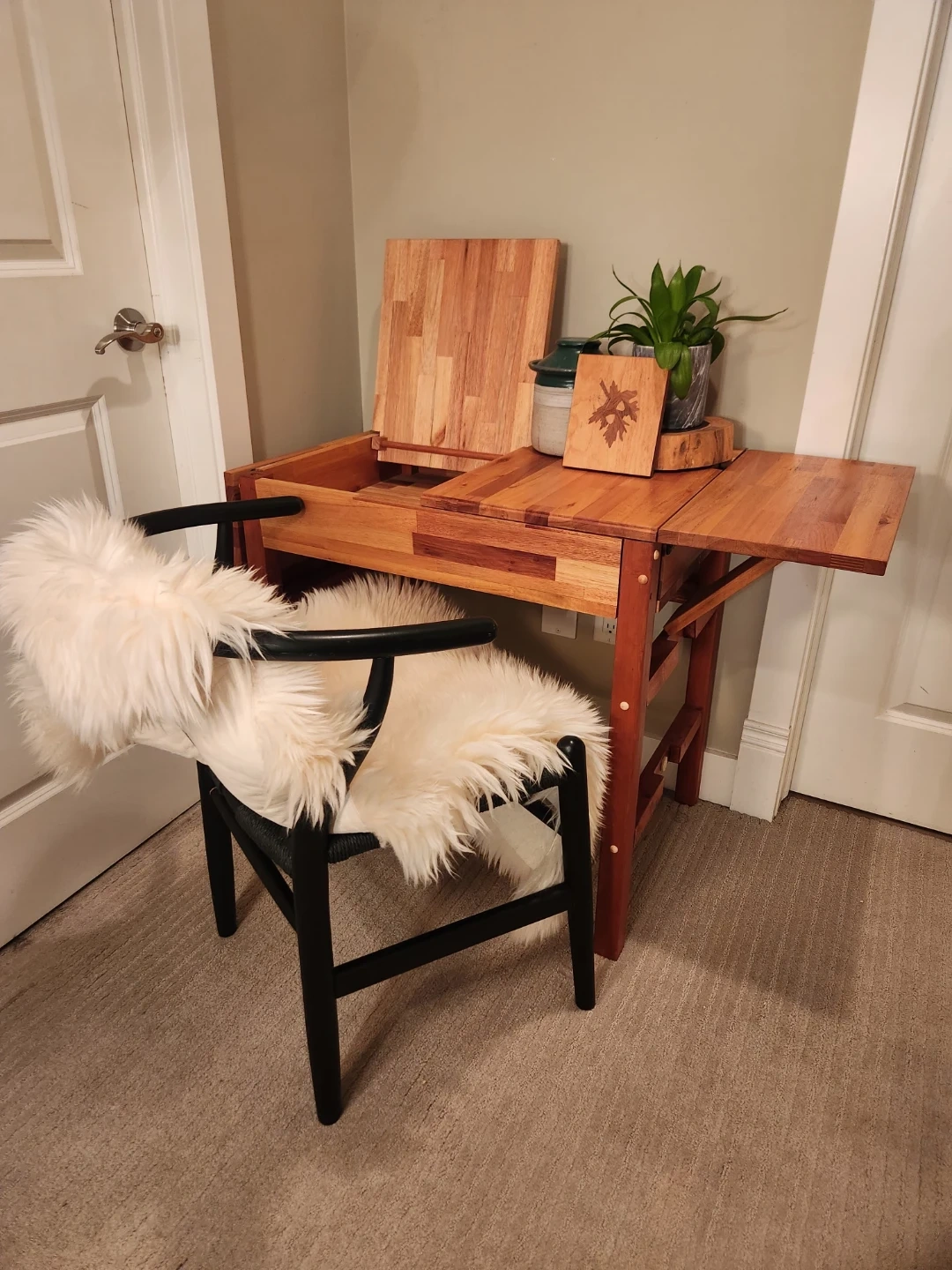 This one of a kind piece has a fantastic danish vibe. Use it as an watercolor, sewing or project table! This solid wood drop leaf table makes a great small space friendly table for eating nooks, offices or bedrooms! It's in FANTASTIC condition and would make a unique side table or entryway table. Each drop leaf is 10 inches wide. Table is 29 inches high. Surface without leaf extension is 27.5x20 inches Storage space under table top is great for hiding supplies, or plans for world domination! The surface converts in 2 shelves for display or works in progress! This treasure provides extra surface space when needed, and it folds away neatly when you're done!