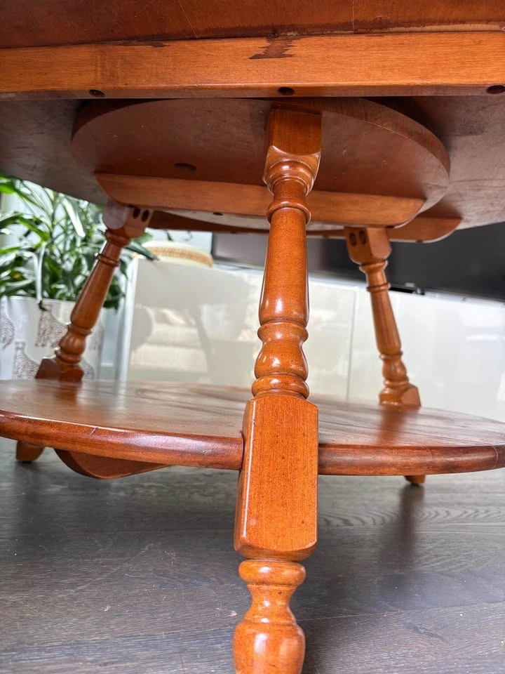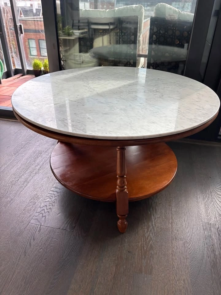 Vintage solid wood round table with original Carrara marble Lazy Susan top. The marble lifts off and spins smoothly. Solid, heavy construction with turned legs and a lower shelf. Real marble, not veneer.