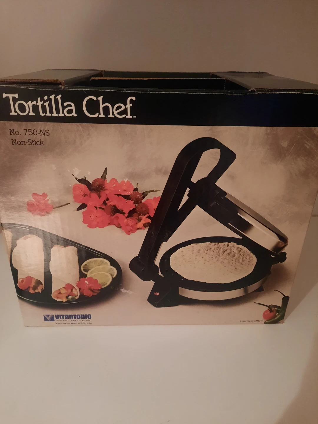 Selling a Vitantonio Tortilla Chef, model No. 750-NS. It's non-stick and comes with the original box and a recipe & instruction booklet. Perfect for making homemade tortillas & More. Brand New.