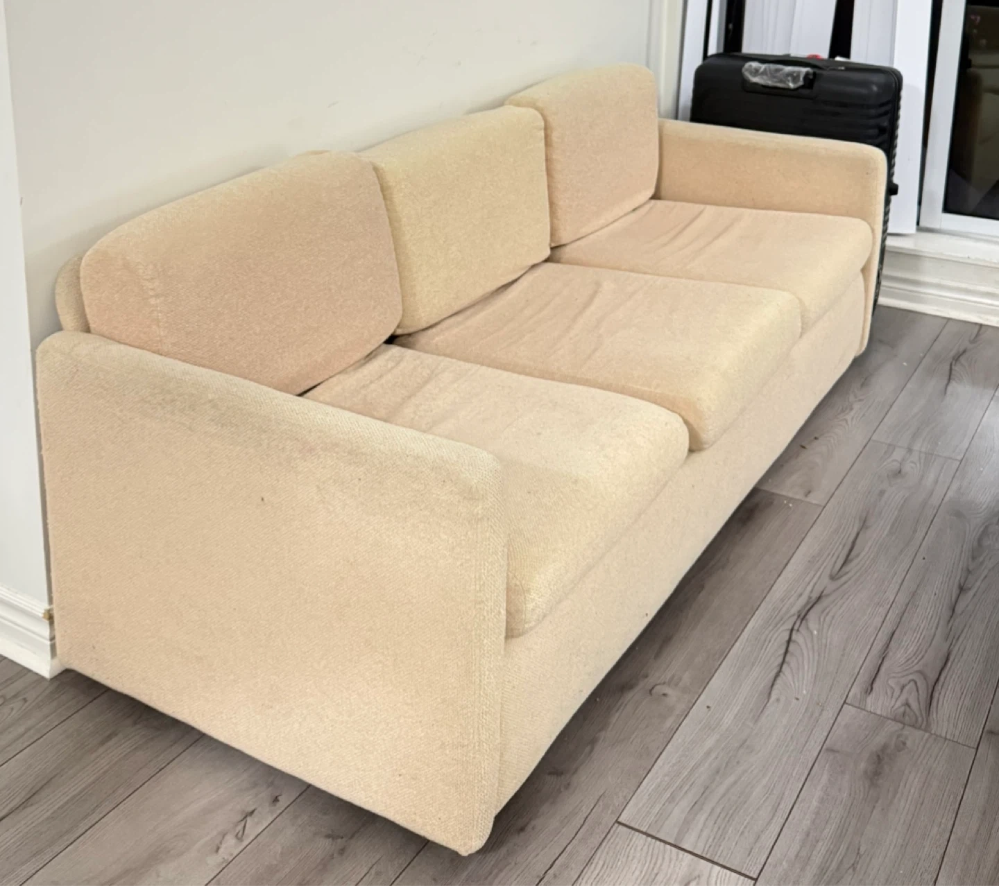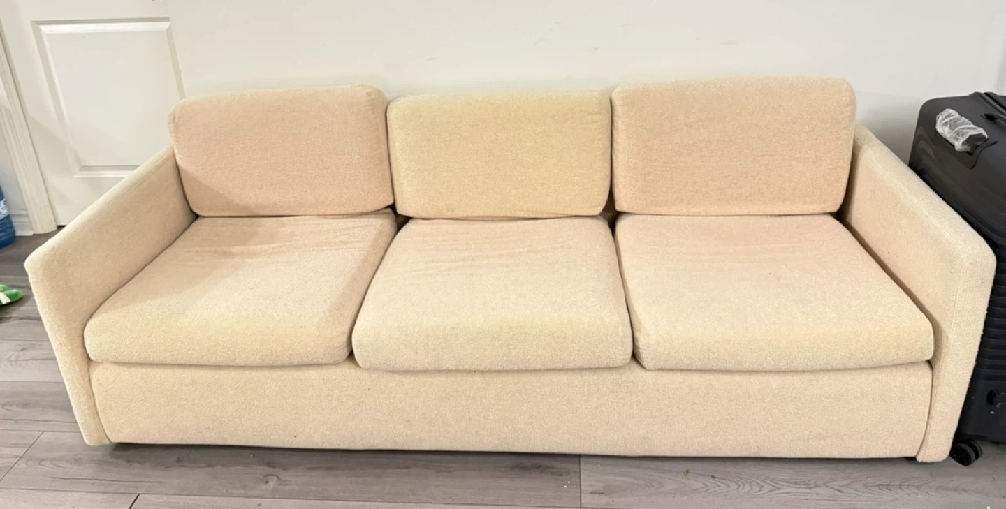 Selling a comfy three-seat sofa! It’s in a neutral beige colour that would fit well in any living room. Perfect for lounging and relaxing after a long day. It's in good condition and ready for a new home!
