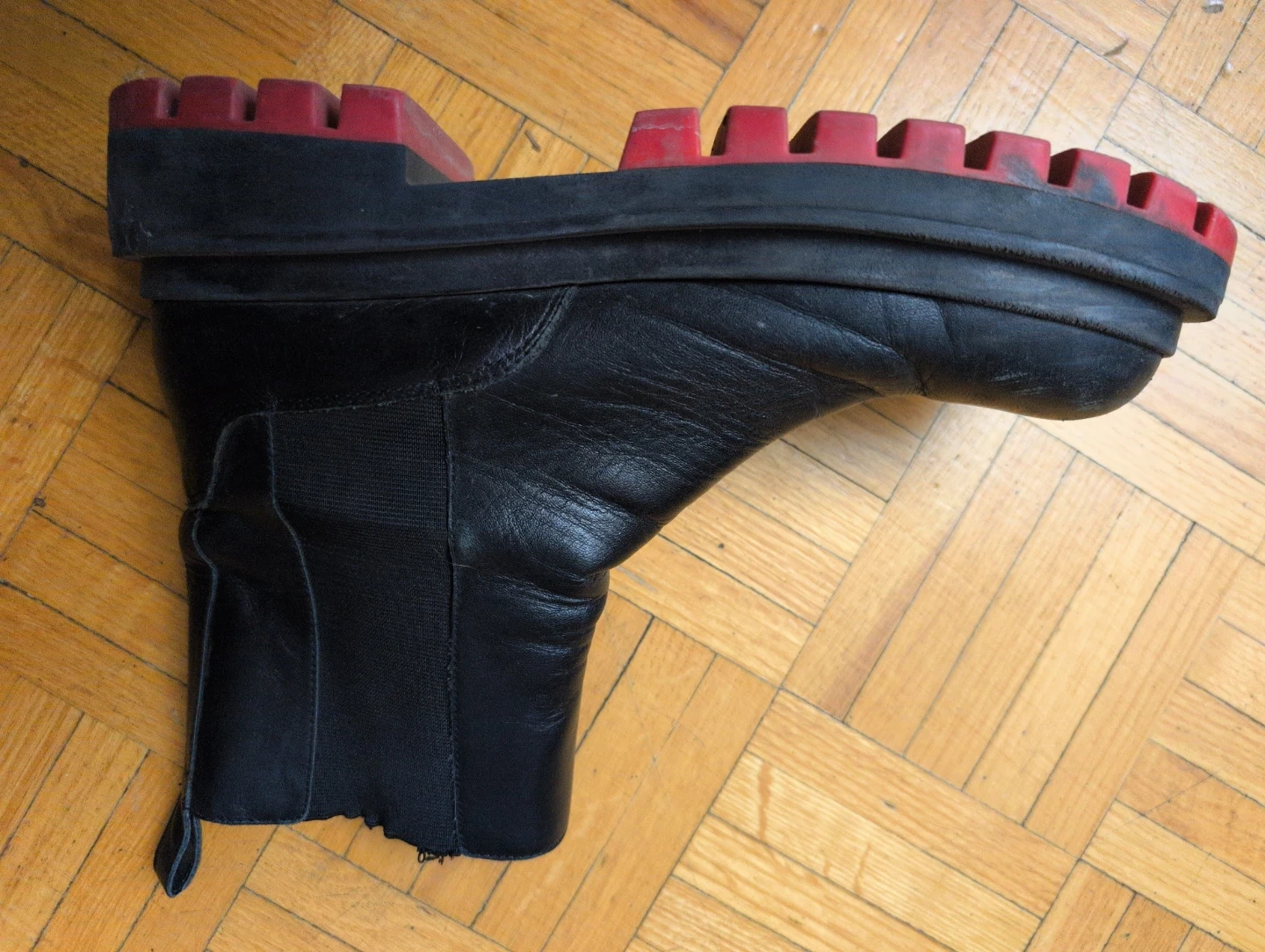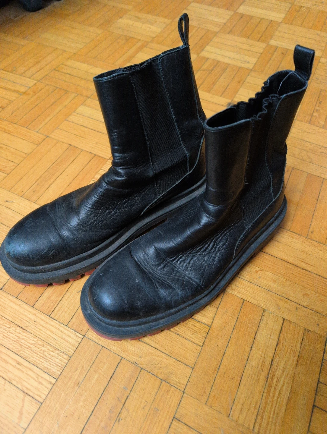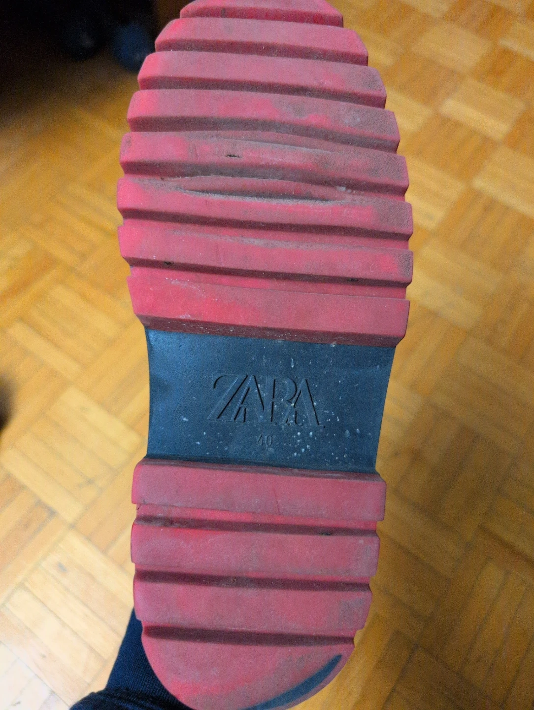 Selling a pair of Zara black leather boots in size 40. They're in good condition and have a unique red and black sole.