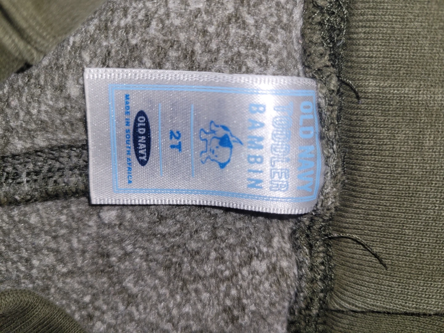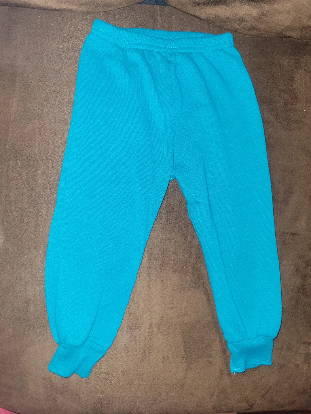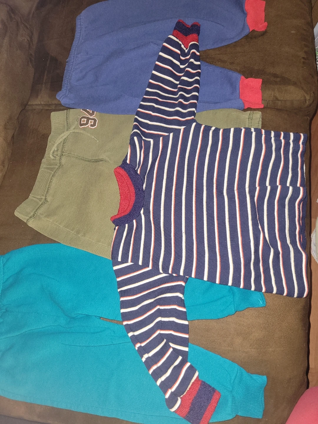 This is a lot of four used size 2T kids clothes, with a long sleeve shirt and three pairs of pants.