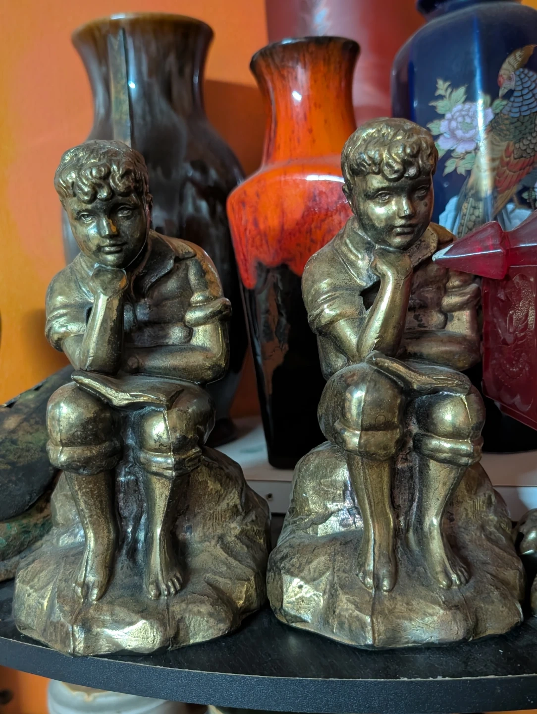 Selling a pair of vintage bronze statues of a boy reading. They have a unique look and would be a lovely addition to any shelf or collection!