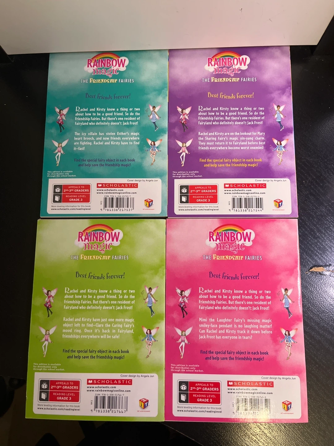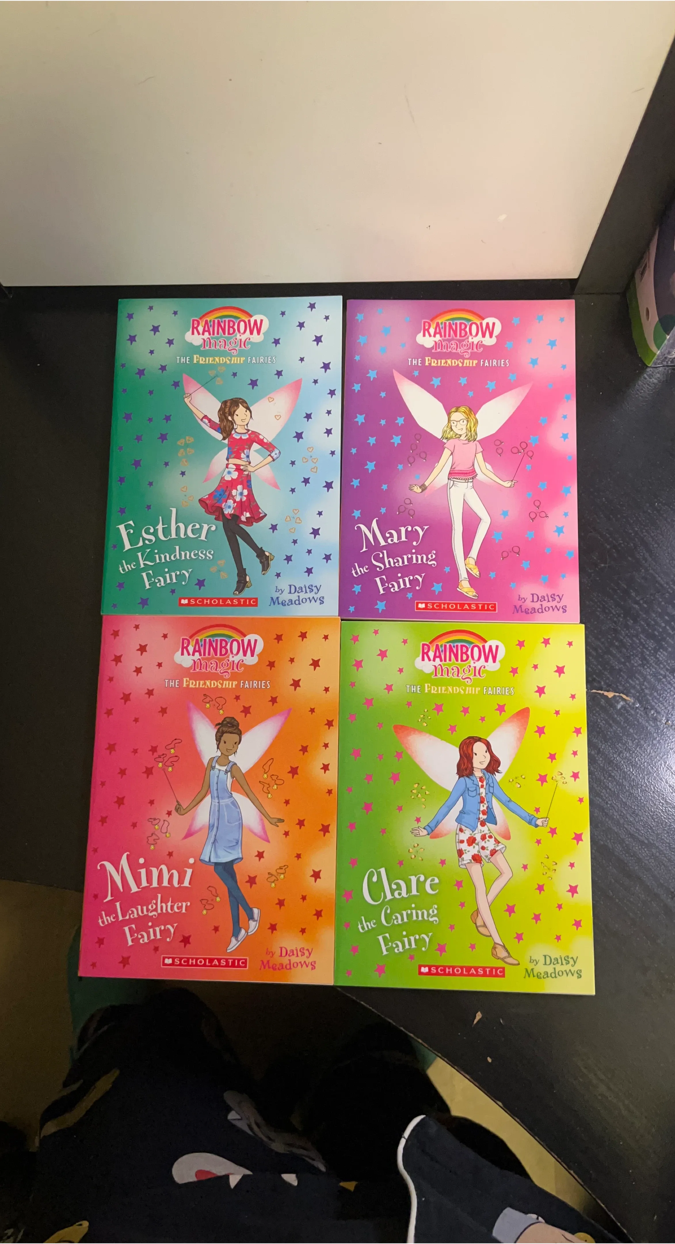 Selling a set of Rainbow Magic: The Friendship Fairies books by Daisy Meadows! Included are: Esther the Kindness Fairy, Mary the Sharing Fairy, Mimi the Laughter Fairy, and Clare the Caring Fairy. These are great books for 2nd and 3rd graders.