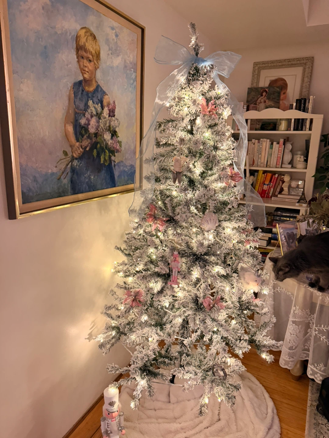 Selling a lovely Christmas tree that's all ready to go! It comes with the lights and so it's super easy to set up and enjoy. Unfortunately selling because my cat (literally in the picture) keeps trying to eat it. Brand new. Just set up for a couple days