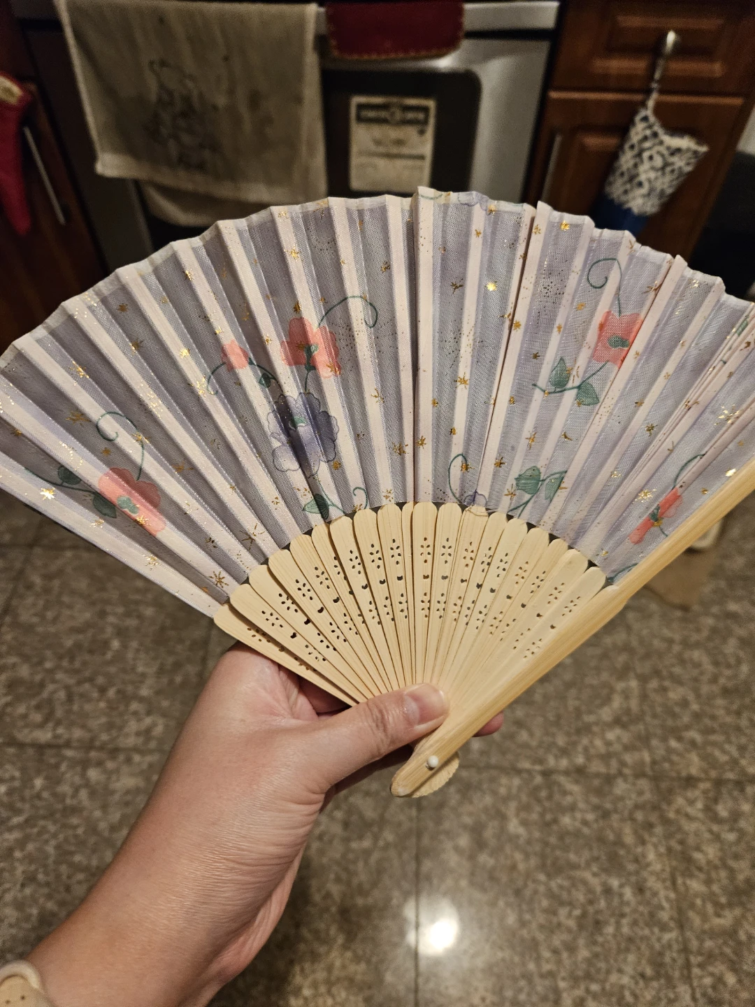 Here's a pretty floral hand fan! It has a lovely design with flowers and gold detailing. Perfect for staying cool and adding a touch of elegance