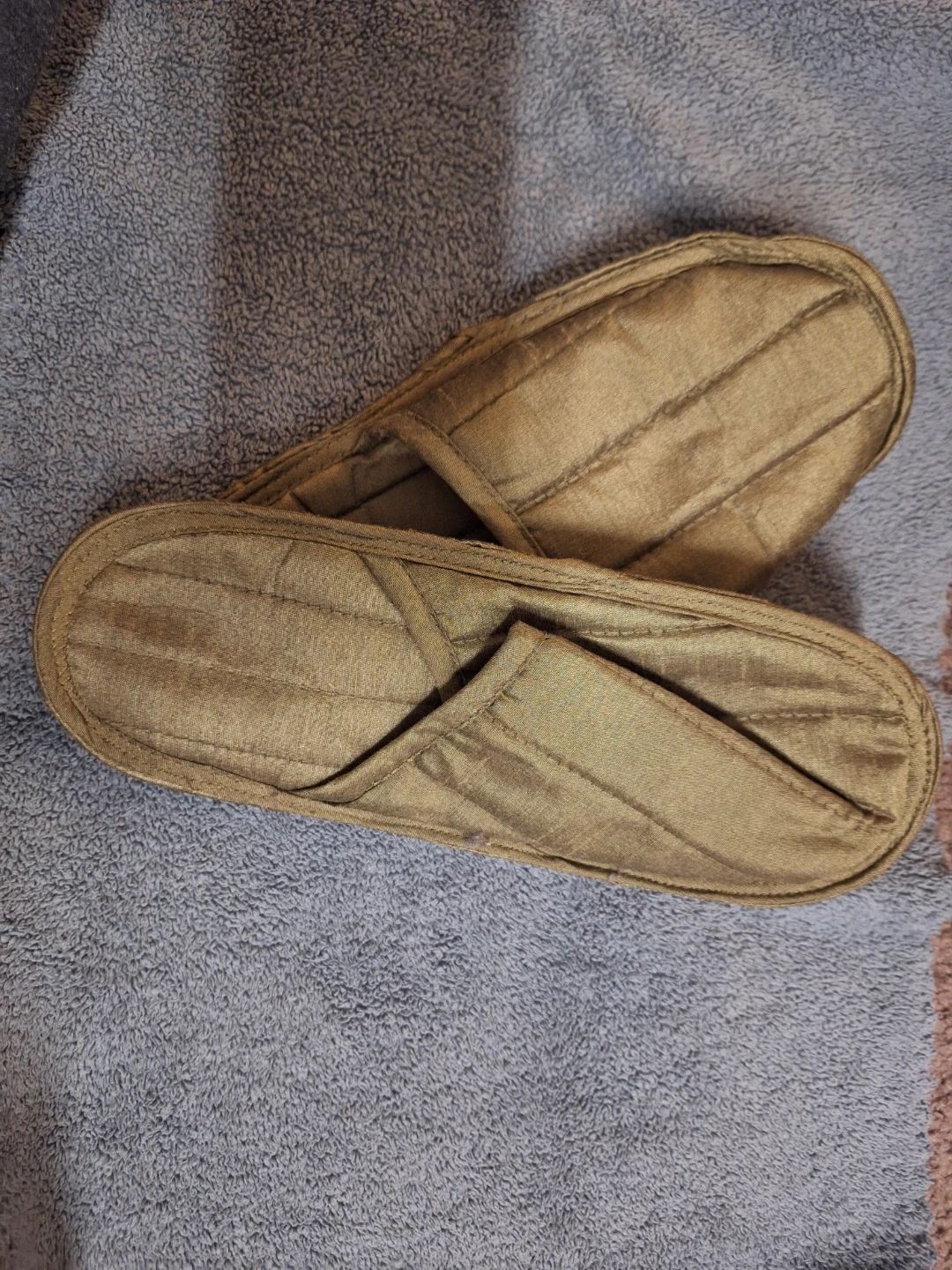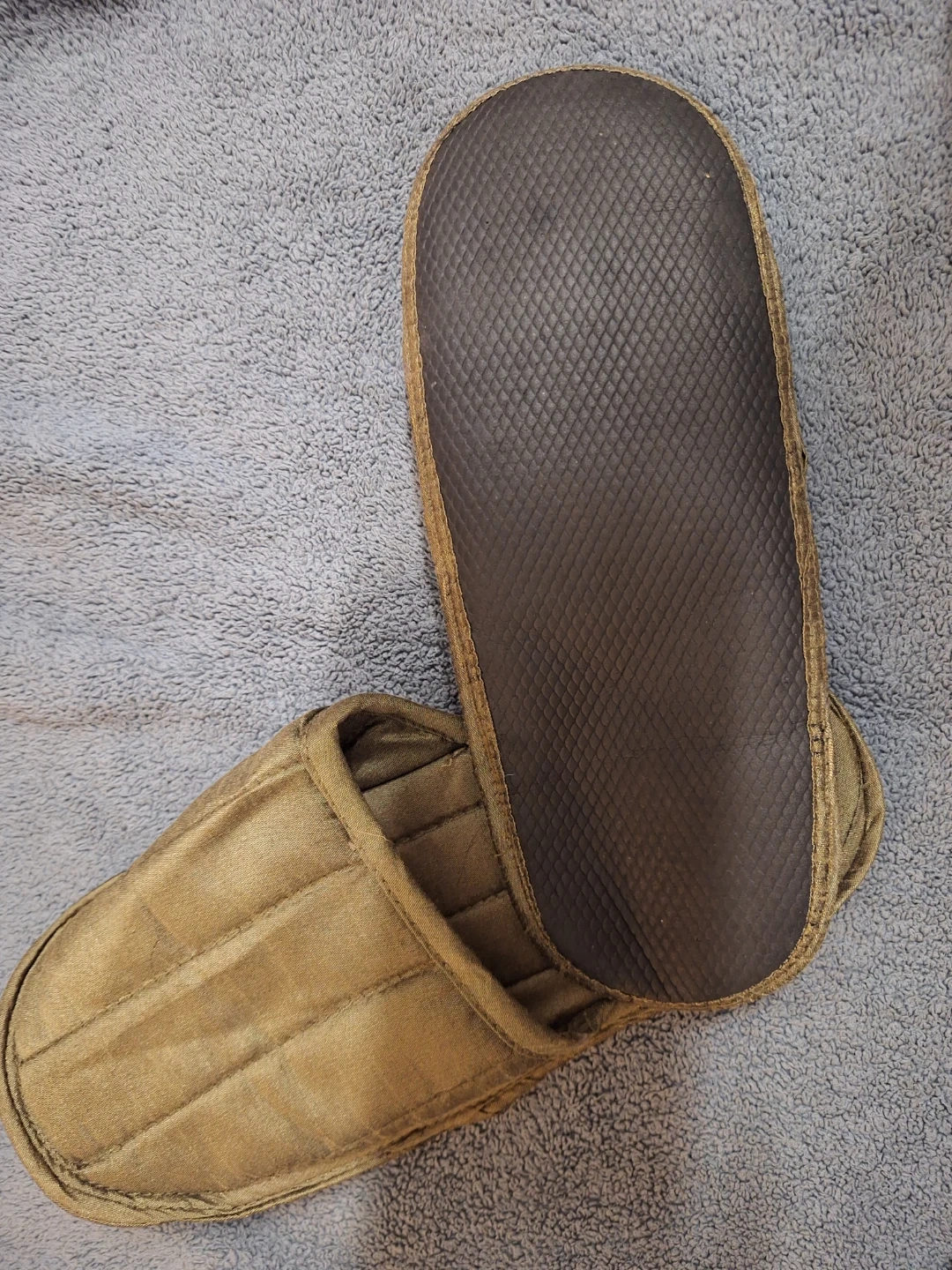 Selling a pair of slippers in a neutral colour. Size is not indicated on the slippers themselves. They appear to be in good condition, with a textured sole.pick up only