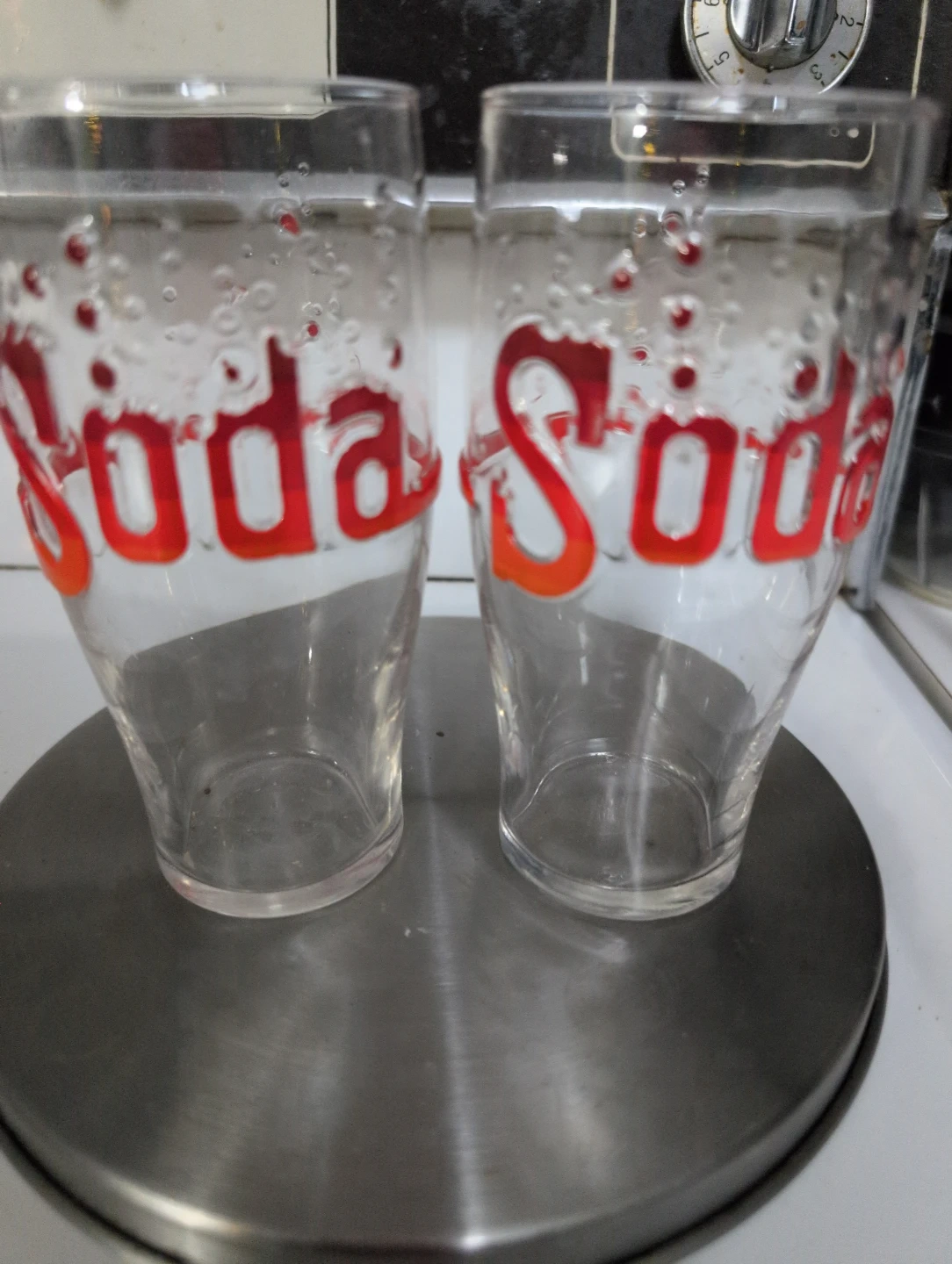 Selling a set of two vintage soda glasses! They feature a fun, retro design with the word "Soda" in red lettering and little bubbles. These glasses are in good condition and would be a great addition to any collection or kitchen
