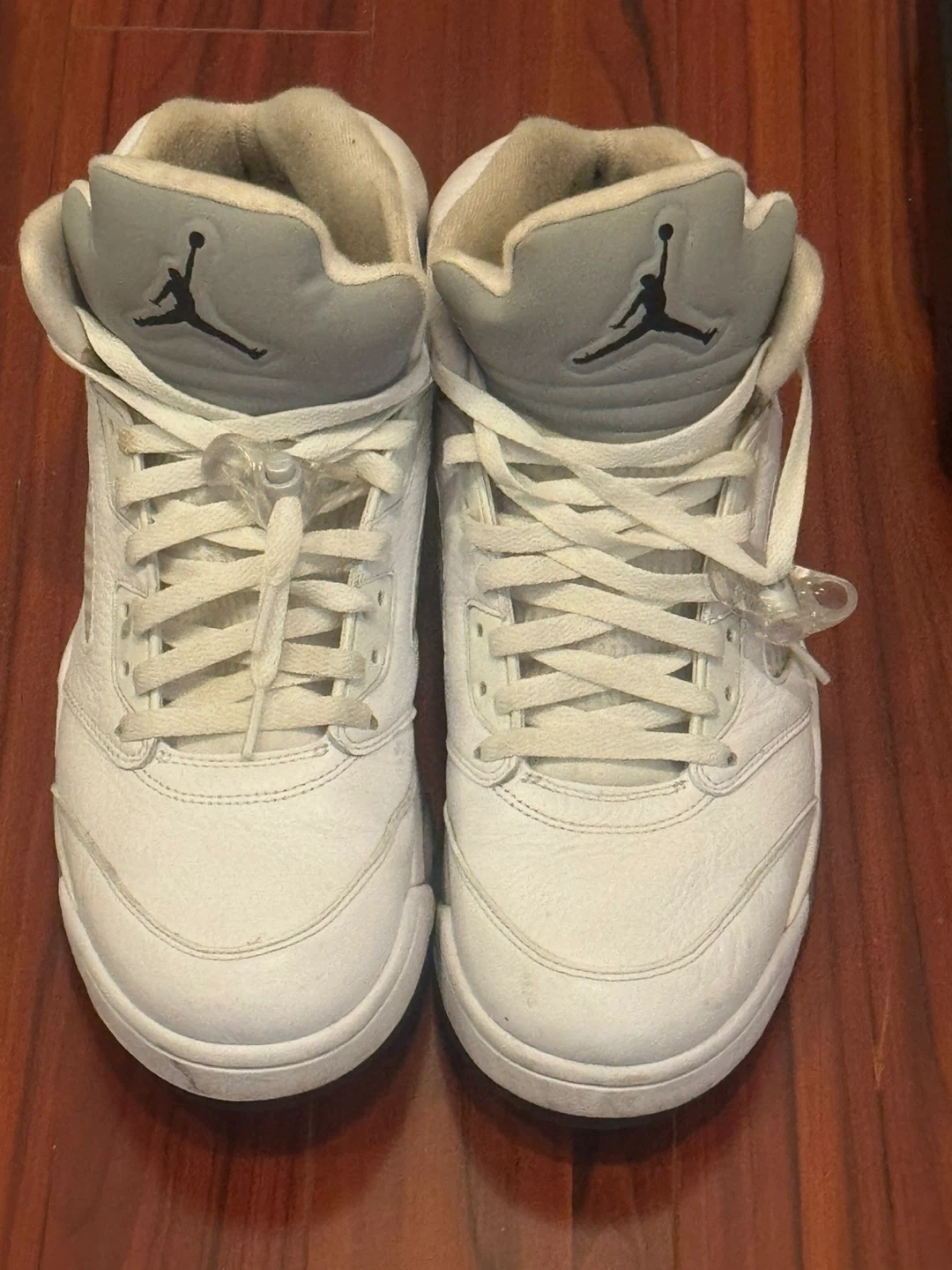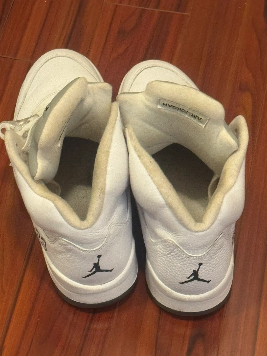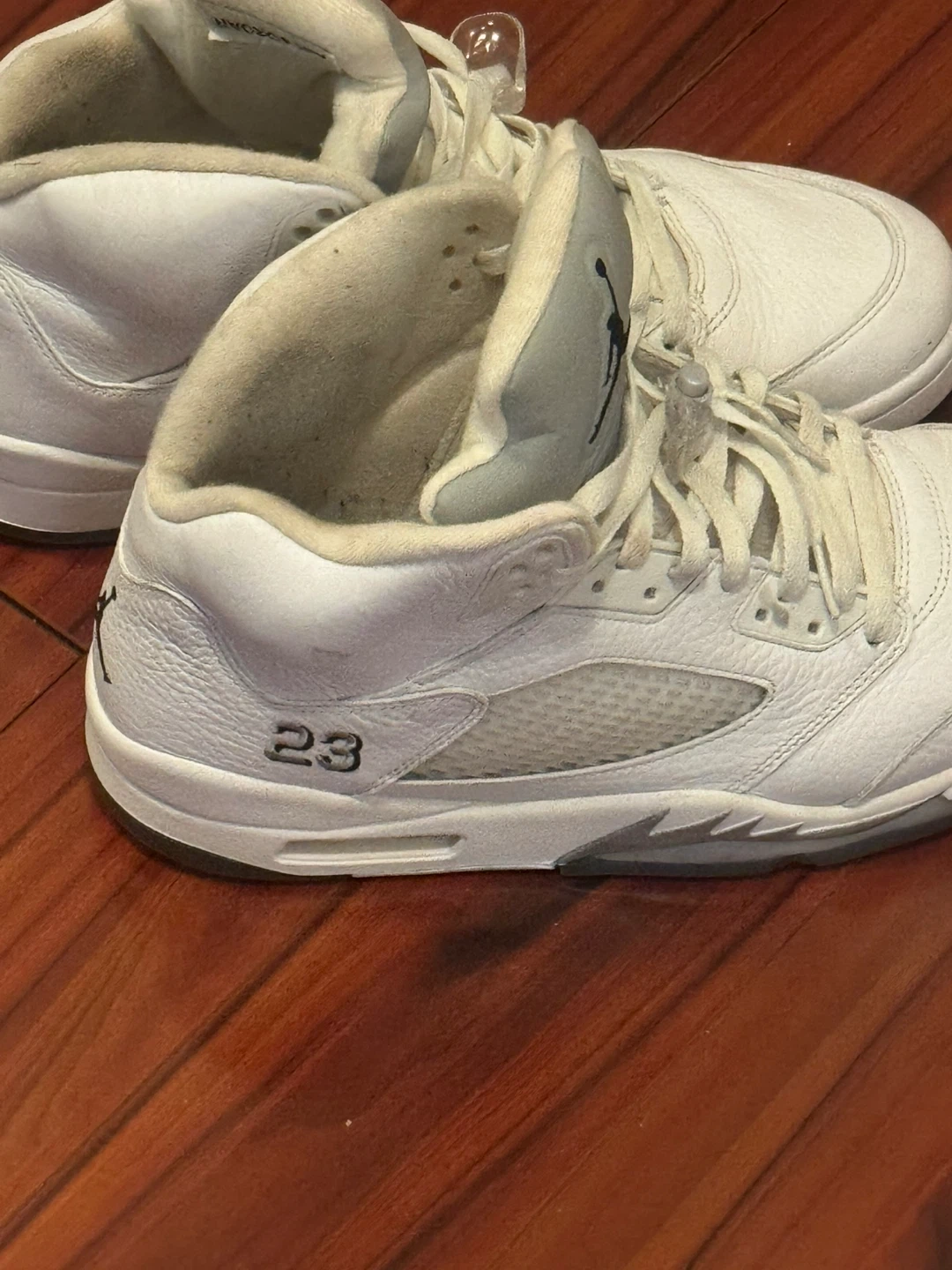 Selling a pair of Air Jordan 5 Retro in white. They are in good condition and have the number 23 on the side. Perfect for basketball or casual wear!