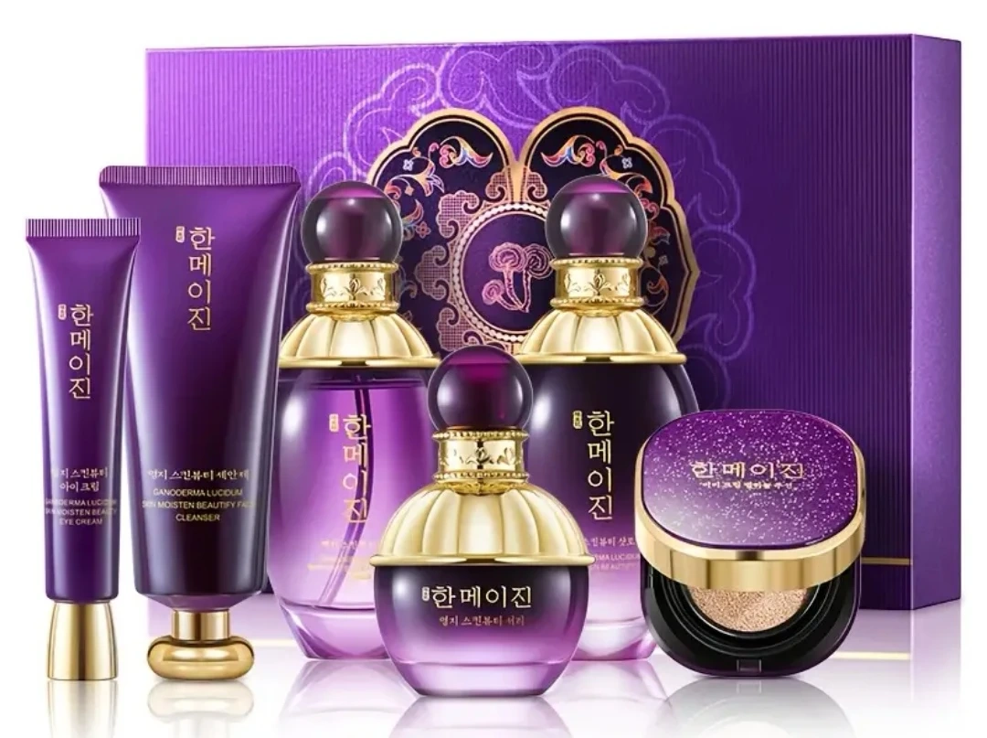 Selling a Hanmeijin cosmetics set. It includes eye cream, cleanser, and other skincare products. The packaging is a beautiful purple colour! Box is slightly dented and plastic is starting to fall apart.