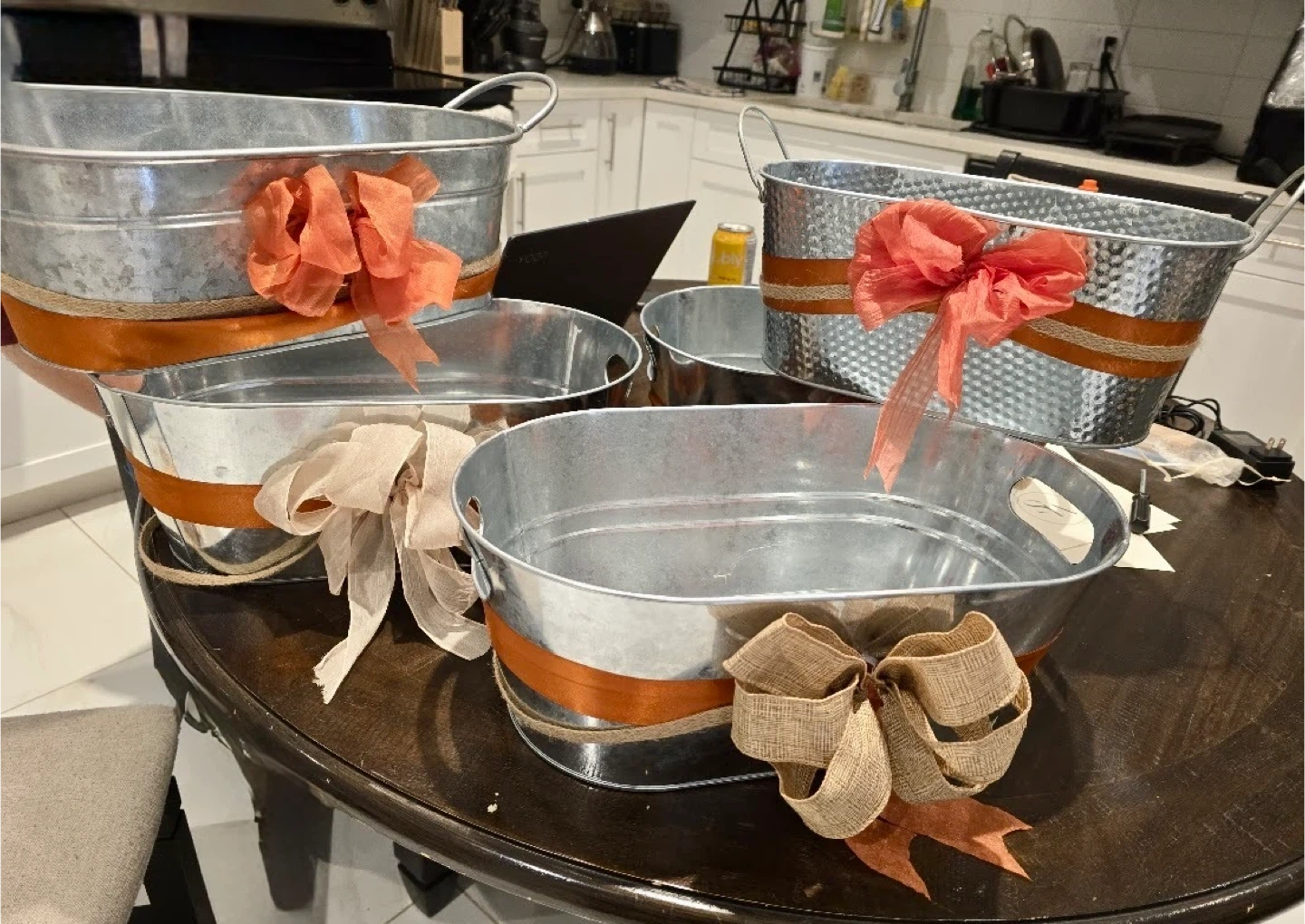 I’m selling a beautiful set of 5 galvanized metal tubs, each decorated with ribbons and bows (which can be easily removed).