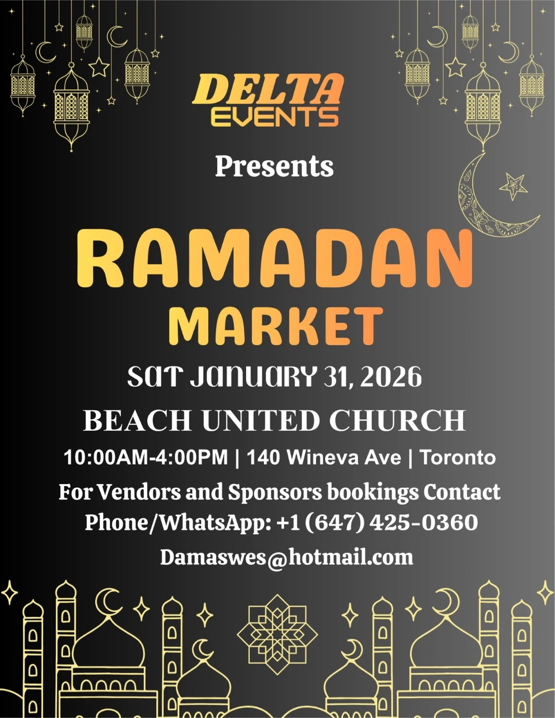 Delta Events presents the Ramadan Market on Saturday, January 31, 2026, at Beach United Church from 10:00 AM to 4:00 PM, located at 140 Wineva Ave in Toronto. Contact +1 (647) 425-0360 or Damaswes@hotmail.com for vendor and sponsor bookings