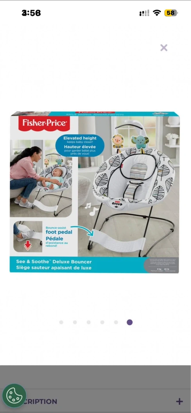 Selling a Fisher-Price See & Soothe Deluxe Bouncer. It features an elevated height and a bounce-assist foot pedal. Perfect for keeping your little one comfy and entertained!