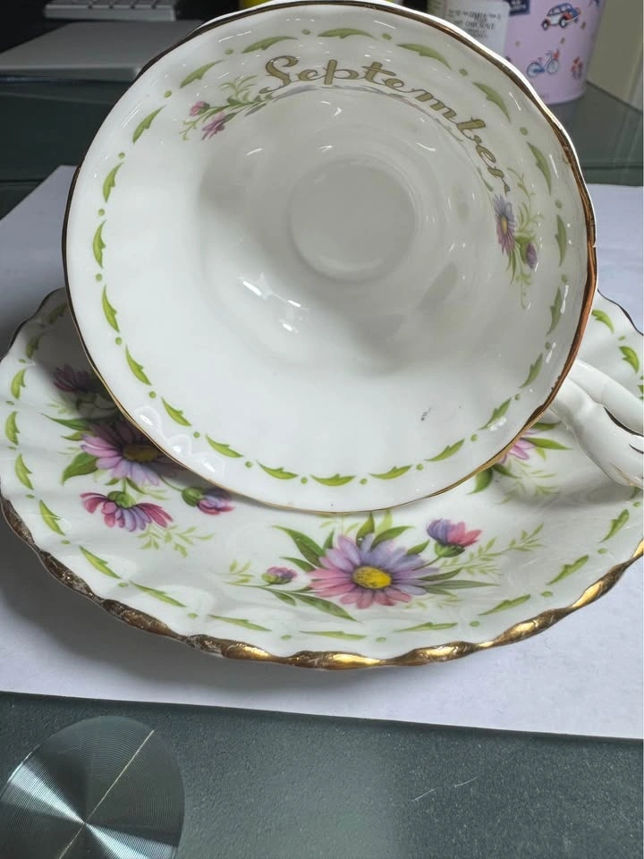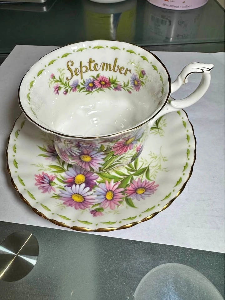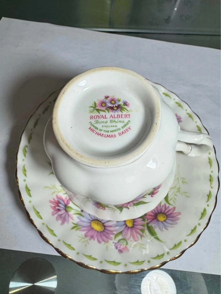 Beautiful Royal Albert Bone China teacup and saucer from the Flower of the Month Series – September (Michaelmas Daisy).