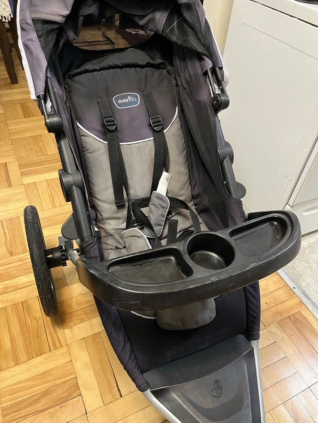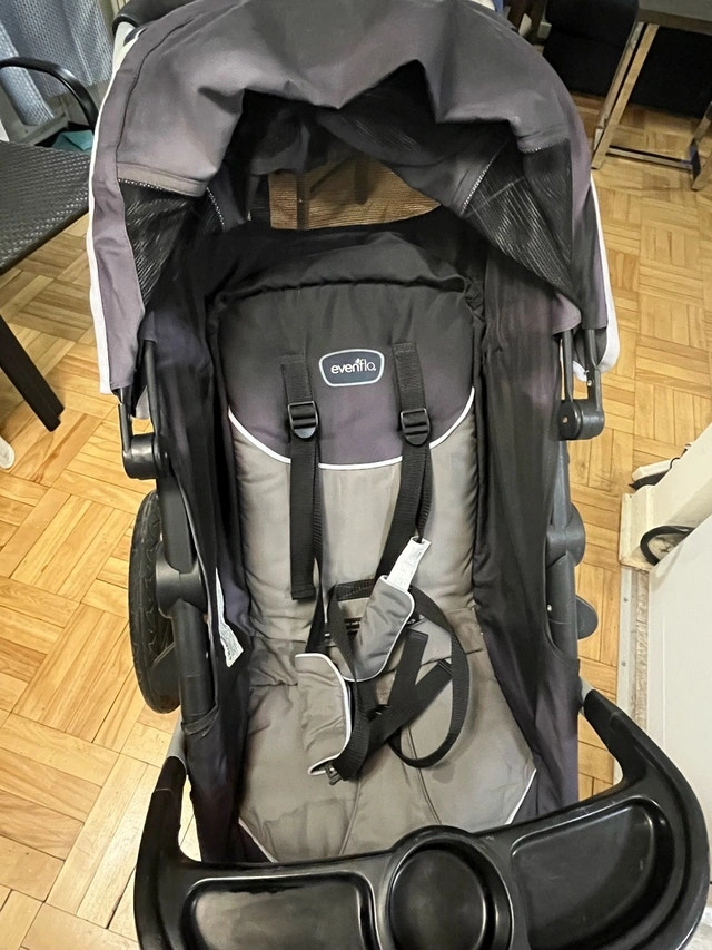 Evenflo Jogger Stroller in good condition, no damage except scratches on the tray and footrest. Pick up location near Sloane and Eglington. Pets and smoke free house.