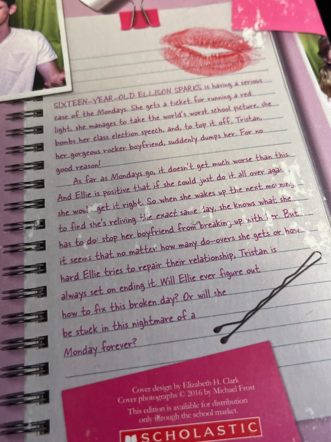 Selling the book "A Week of Mondays" by Jessica Brody! It's a novel about a sixteen-year-old named Ellison Sparks who gets a ticket for running a red light. She gets to relive the same day, and has to stop her boyfriend from breaking up with her