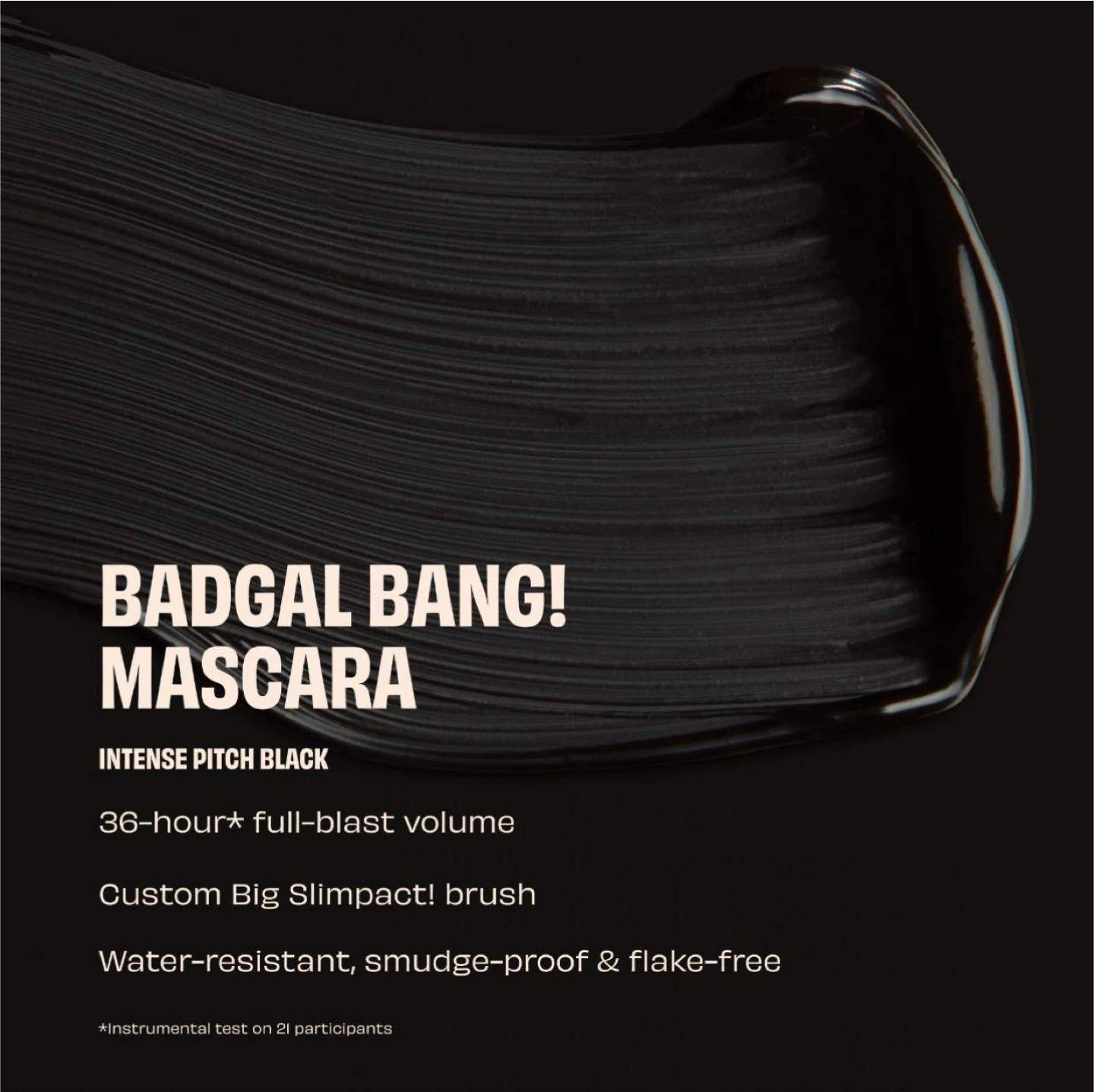 Get ready for intense volume with Benefit's BADgal BANG! Mascara in Intense Pitch Black! This mascara features a custom Big Slimpact! brush that delivers 36-hour* full-blast volume. It's also water-resistant, smudge-proof, and flake-free, so you can rock your lashes all day long! *Instrumental test on 21 participants
