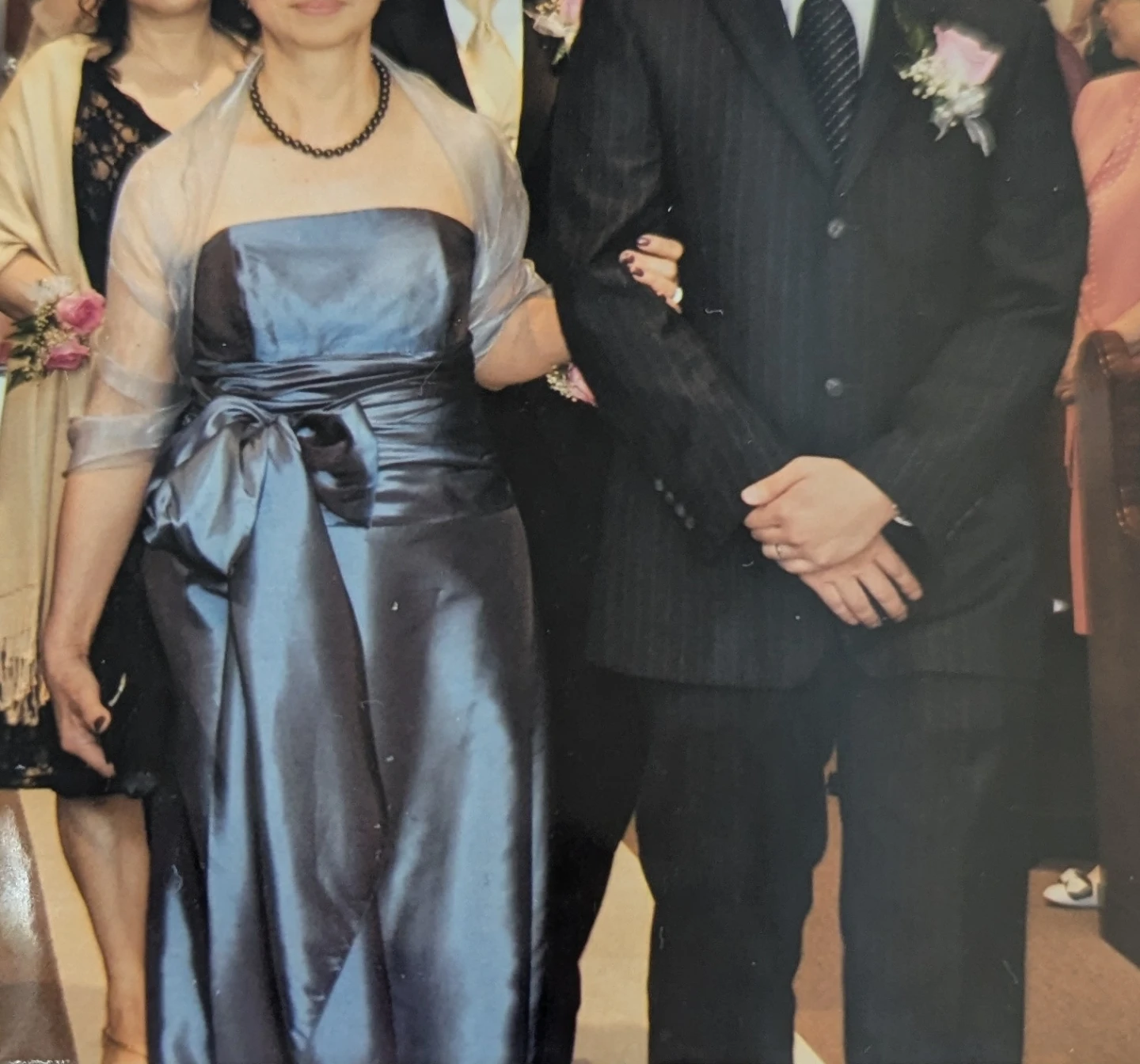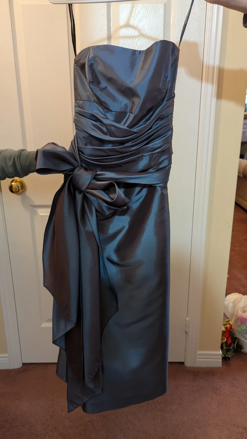 Selling a beautiful elegant/formal dress in size 10! It's a lovely blue-grey colour and features a stylish bow detail. Comes with sheer matching shawl. In excellent condition - only worn once for wedding reception.