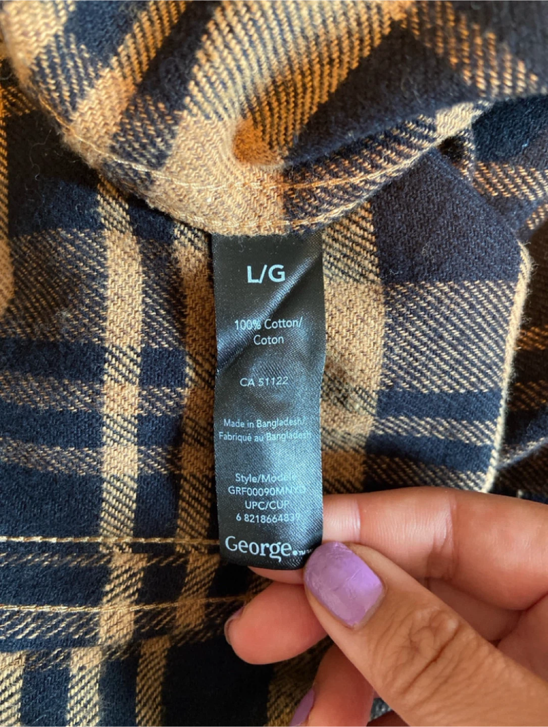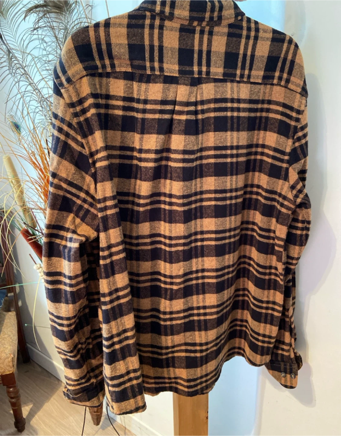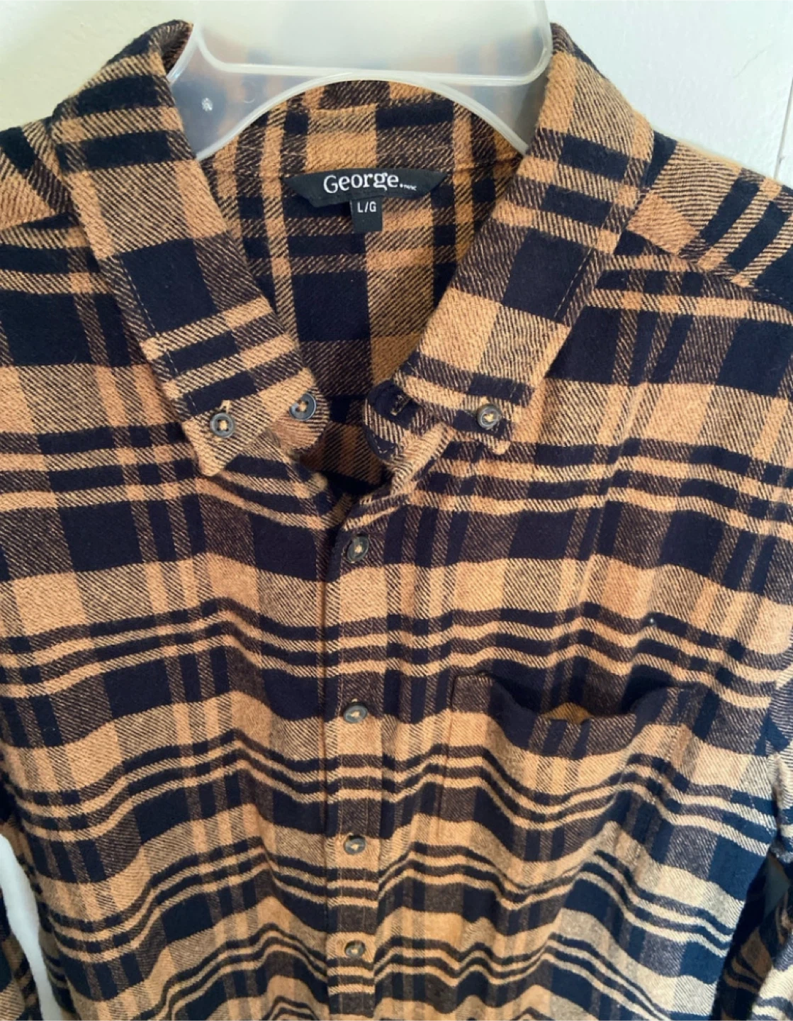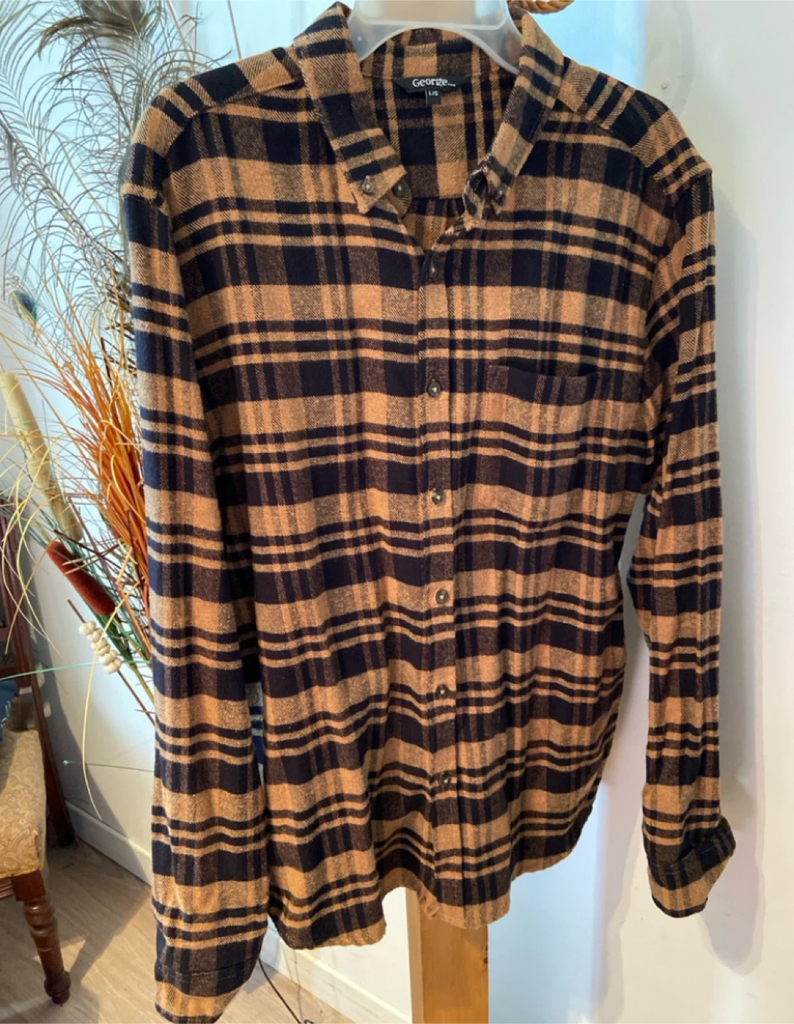 This is a used George brand flannel shirt, perfect for casual wear and providing warmth on cooler days. It features a classic plaid pattern in black and gold tones. The shirt is in good condition, hardly worn