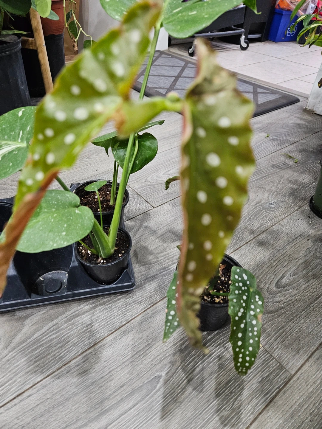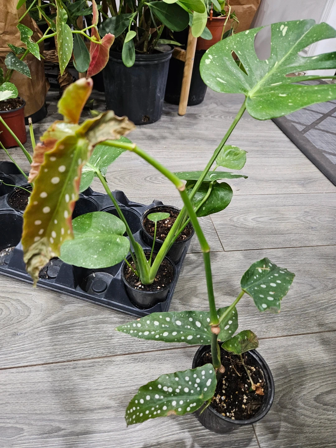 Selling a healthy polka dot begonia plant! It's got beautiful dark green leaves with white spots. This one is easy to care for and adds a pop of colour to any room
