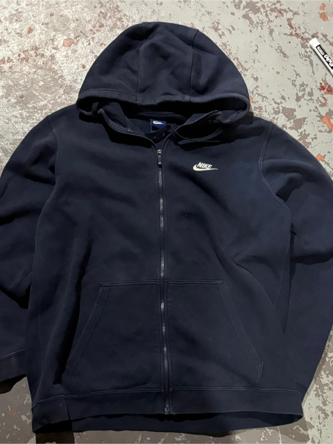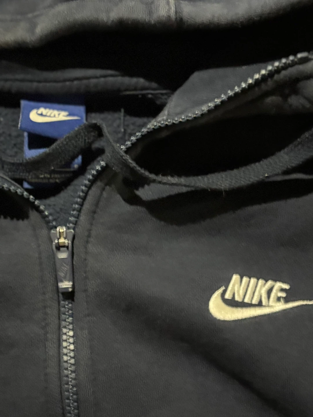 Selling a Nike full zip hoodie in navy blue. It's in great condition and perfect for layering! The Nike logo is embroidered on the chest. Size is not indicated on the tag, but it fits like a men's medium. A classic and comfortable hoodie for everyday wear