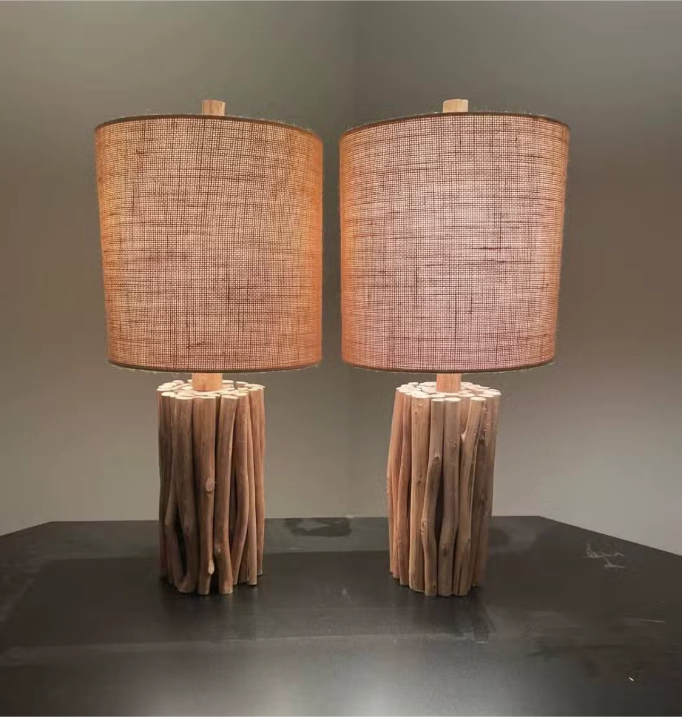Selling a pair of unique table lamps with a natural wood base and woven shade. They add a touch of rustic charm to any room!