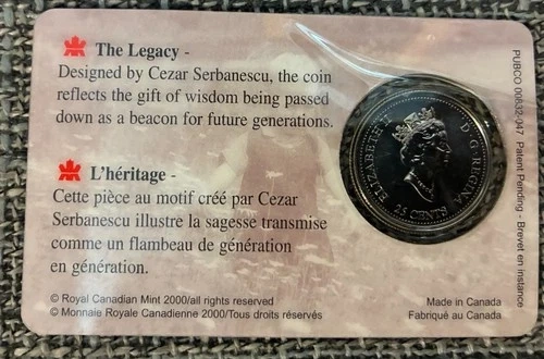 Sealed Artist Tribute Collection. 2000 Millennium Quarter Series September- WisdomCrafted with precision, the Canada 2000 "Wisdom" Collectible Commemorative Quarter stands as a testament to Canadian heritage and numismatic artistry. Struck in nickel and boasting an uncirculated quality, this 25-cent piece captures the essence of collectible coinage, free from the marks of time that circulated coins bear. Though uncertified, the coin's allure lies in its representation of Canada's millennium year and the symbolism of "Wisdom" it embodies. A piece that resonates with both collectors and those who appreciate the storied tapestry of Canadian culture, it is an emblematic addition to any collection.