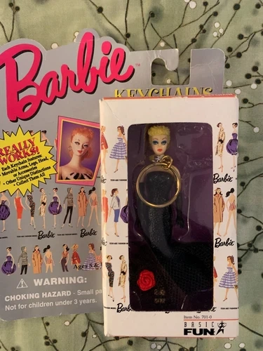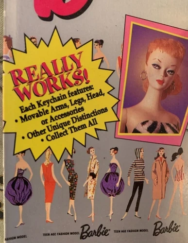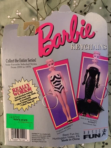 This vintage Barbie keychain from 1995 is a rare find for collectors. Featuring the iconic "Solo in the Spotlight" Barbie from 1960, this keychain is still sealed and in excellent condition. This collectible figure is a must-have for any Barbie fan, with the added bonus of being a functional keychain. Don't miss your chance to own a piece of Barbie history with this 1995 vintage keychain. Box is 5.5"x3"