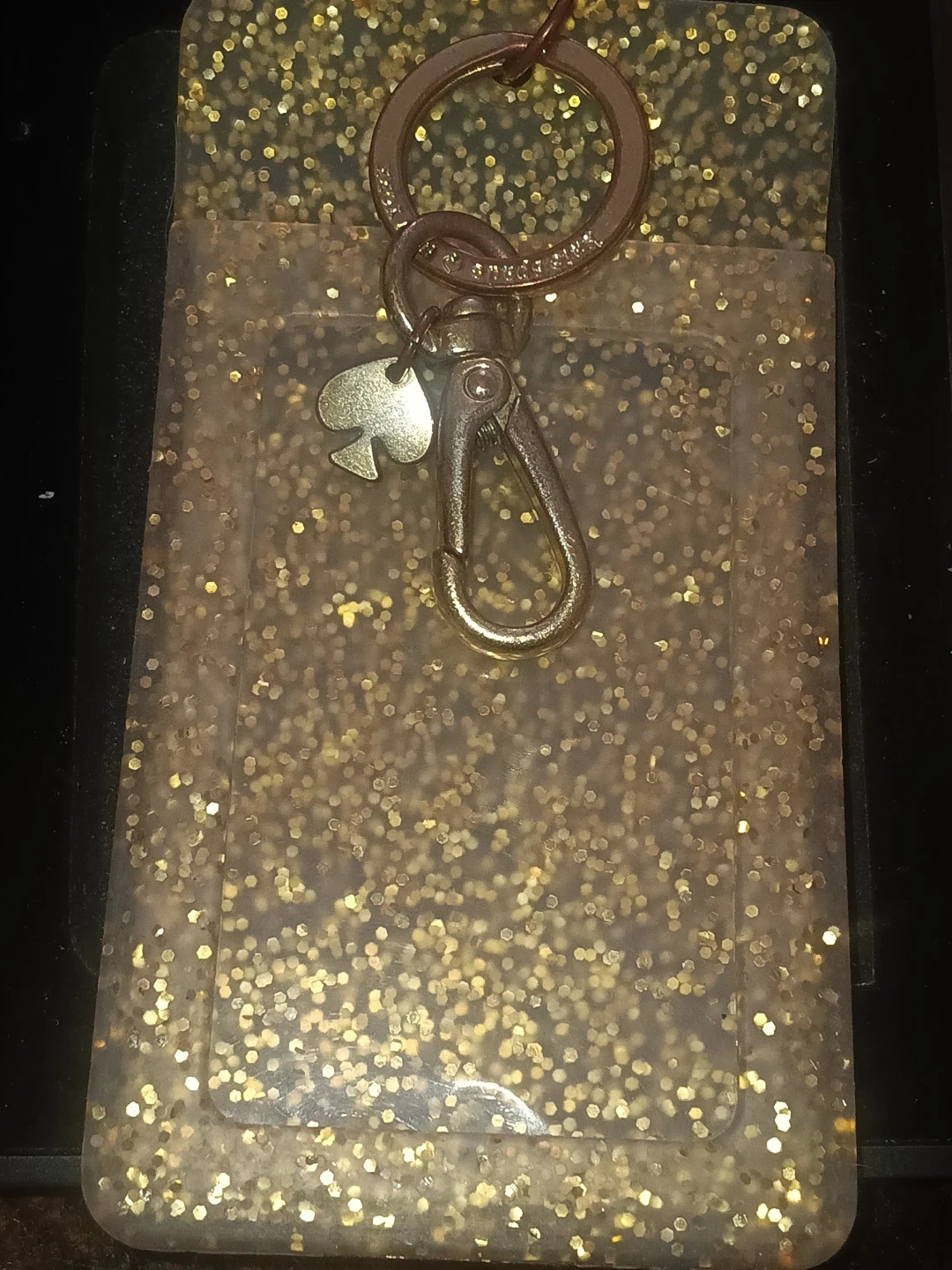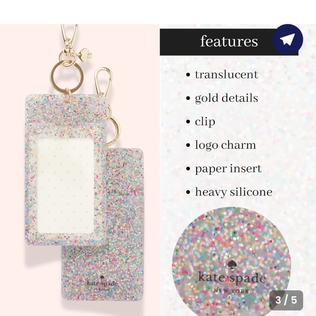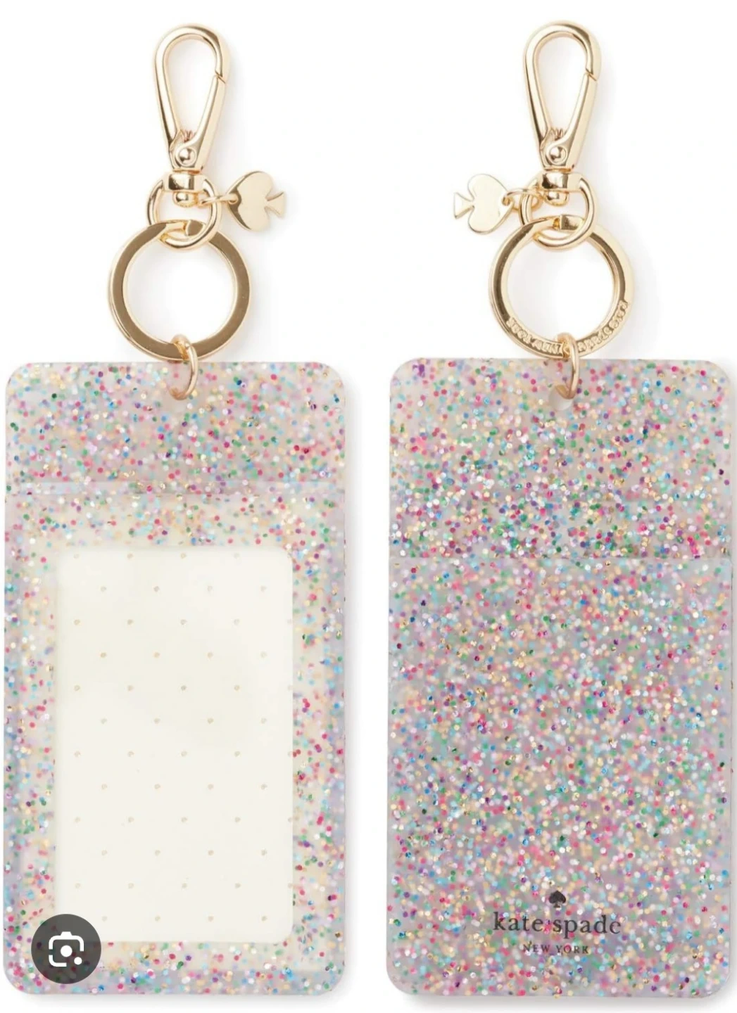 This Kate Spade ID holder is made of a confetti silicone material. It's roughly 5 inches tall x 2.75 inches wide. The front ID window is 3 inches high x 2.88 inches wide and has a clear cover for visibility and protection. It features gold metal hardware accents and includes a back pocket to hold business cards, credit cards, driver's licenses, etc. It can be clipped onto a lanyard to use as an ID badge or fastened to your car key ring