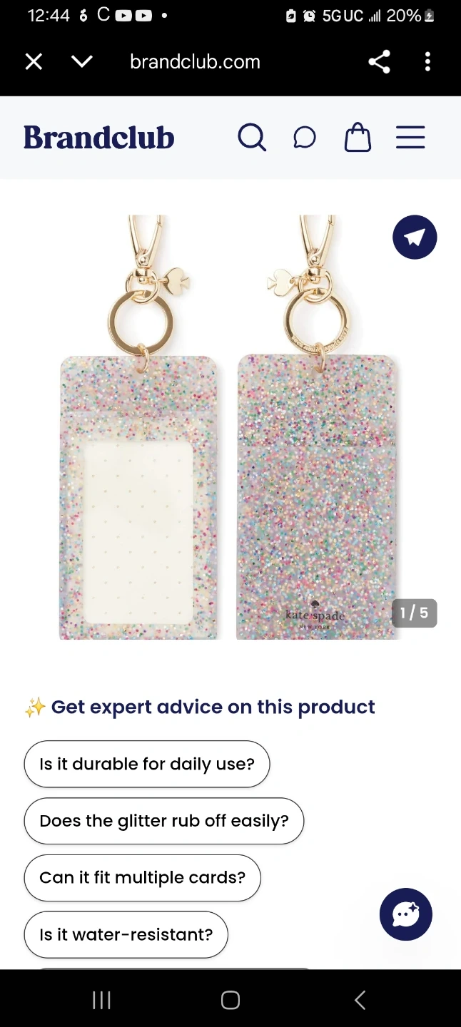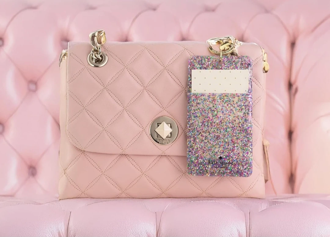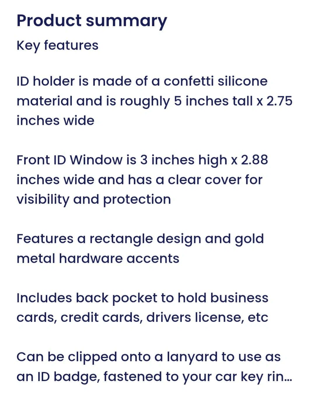 This Kate Spade ID holder is made of a confetti silicone material. It's roughly 5 inches tall x 2.75 inches wide. The front ID window is 3 inches high x 2.88 inches wide and has a clear cover for visibility and protection. It features gold metal hardware accents and includes a back pocket to hold business cards, credit cards, driver's licenses, etc. It can be clipped onto a lanyard to use as an ID badge or fastened to your car key ring