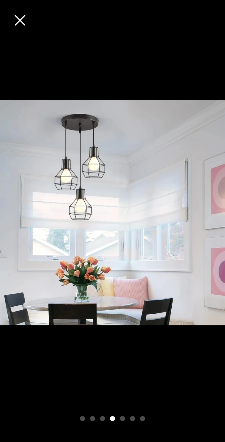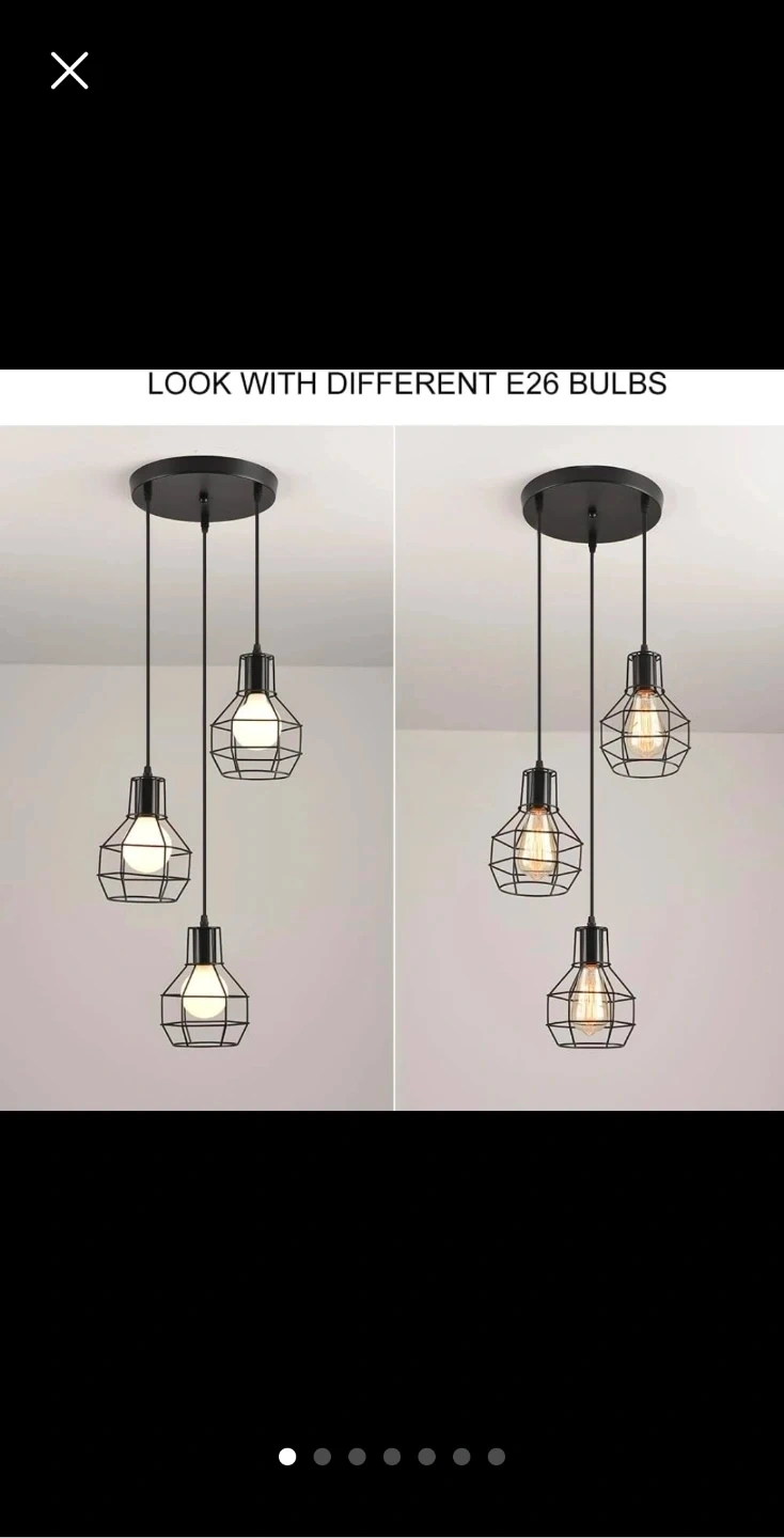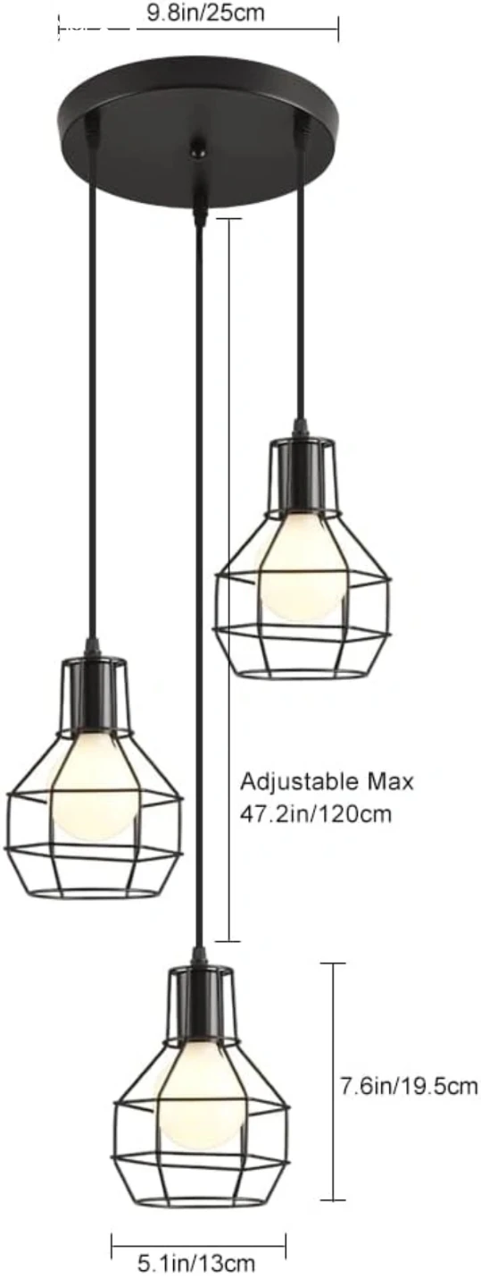 Selling a stylish black cage pendant light! It has three lights, each with a unique cage design. The drop is adjustable up to 47.2 inches (120cm). The light fixture itself is 9.8 inches (25cm) in diameter. The cages are approximately 7.6 inches (19.5cm) tall and 5.1 inches (13cm) wide. Looks great with different E26 bulbs!