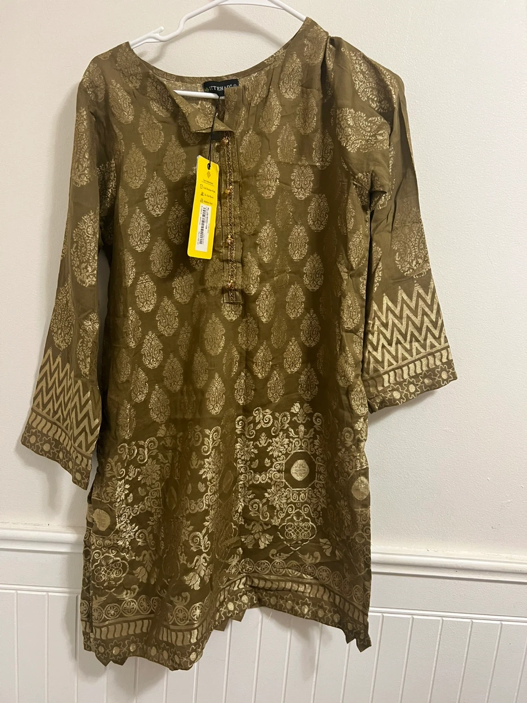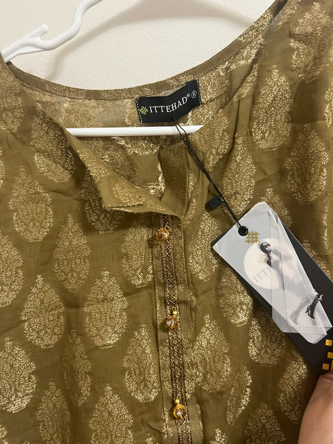 Selling a brand new Ittehad women's kurti with tags still attached! The kurti features a lovely gold pattern on a brown/olive-green base. Perfect for a special occasion or everyday wear. Feel free to message me with any questions!